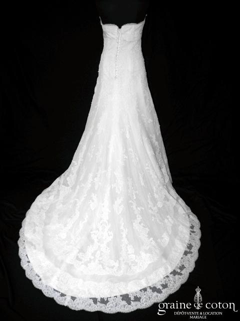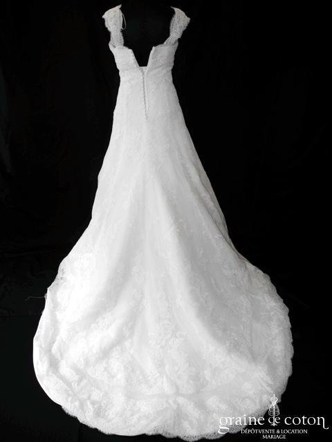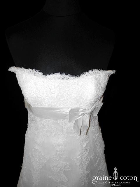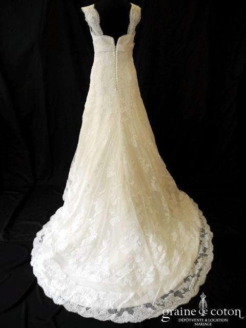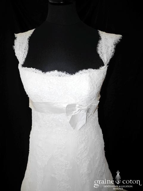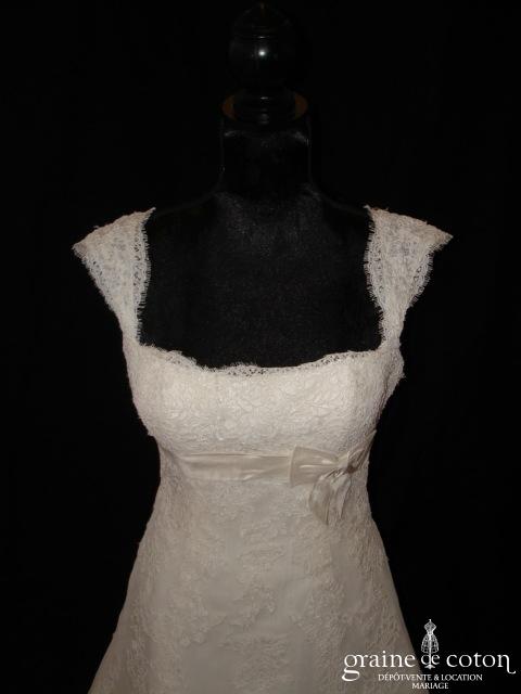 Robe une pièce tout en dentelle de Calais ivoire clair : bustier taille empire soulignée d’une ceinture de perles, bretelles amovibles larges en dentelle, dos boutonné. Jupe s’évasant façon sirène, …