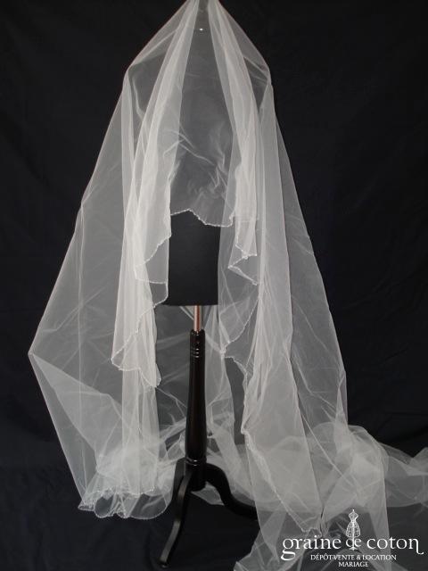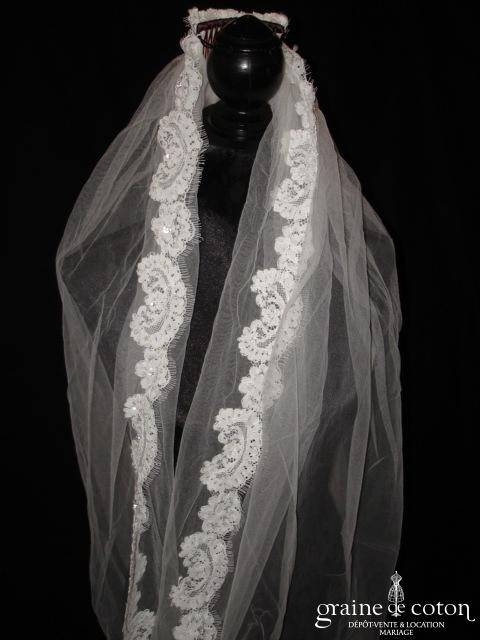 Voile long de 3 mètres en tulle ivoire bordé de fines perles, rabat avant en plus de 70 cm. Monté sur peigne.