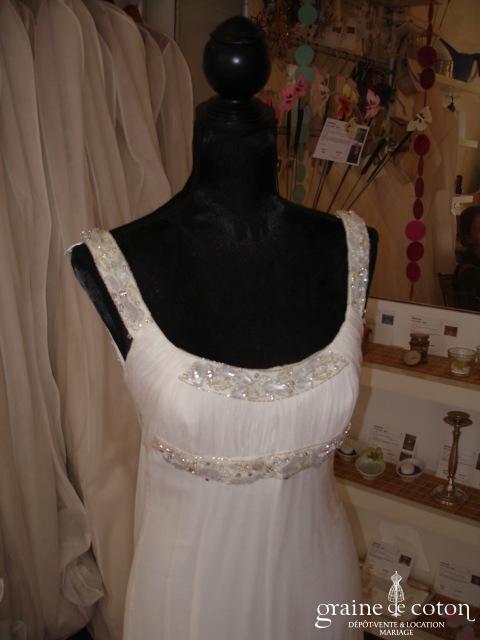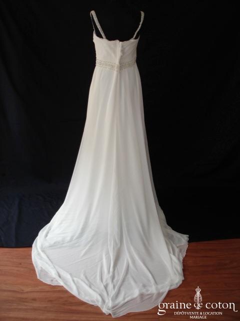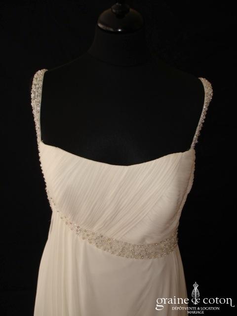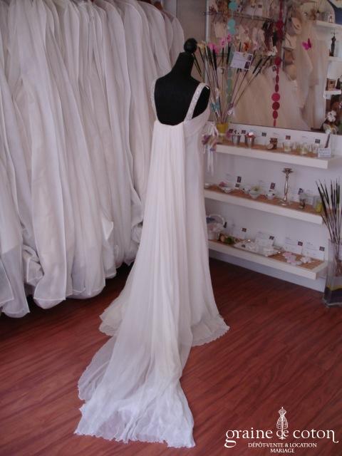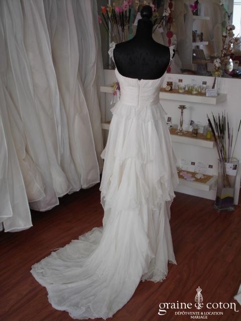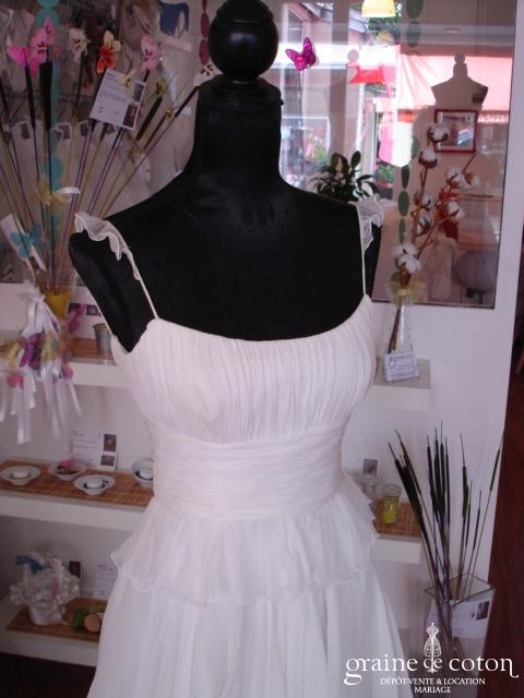 Robe une pièce en tulle de soie plissé ivoire : bustier forme coeur et taille empire soulignée d’une ceinture de strass. Jupe fluide épurée avec toute petite traîne. Bohème chic, …