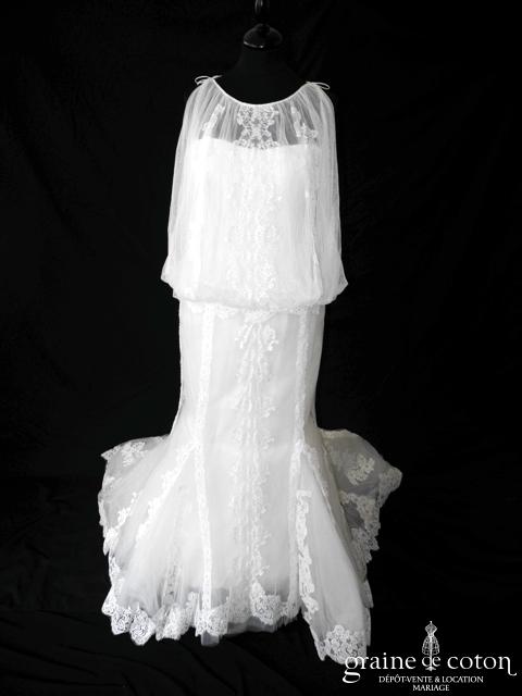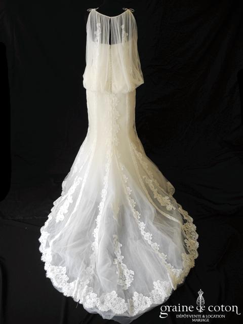 Robe une pièce en dentelle et tulle de soie ivoire : bustier en dentelle recouvert de tulle flouté attaché en bretelles, dos boutonné. Joli jeu de transparence. Jupe sirène évasée …