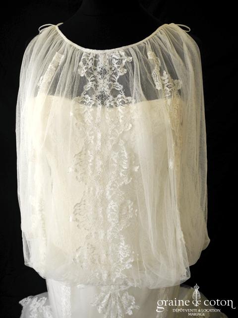 Robe une pièce en dentelle de Calais ivoire : bustier avec petites manches courtes sur le bord des épaules, taille haute. Jupe évasée trapèze en dentelle et tulle plumetis ivoire, …