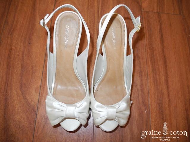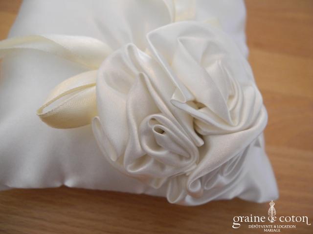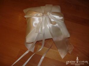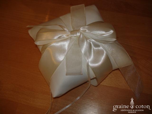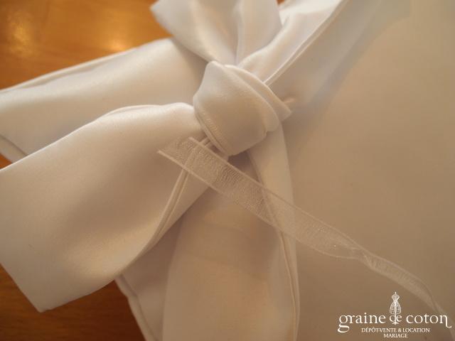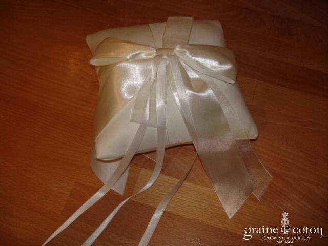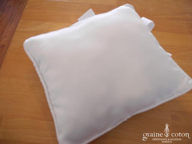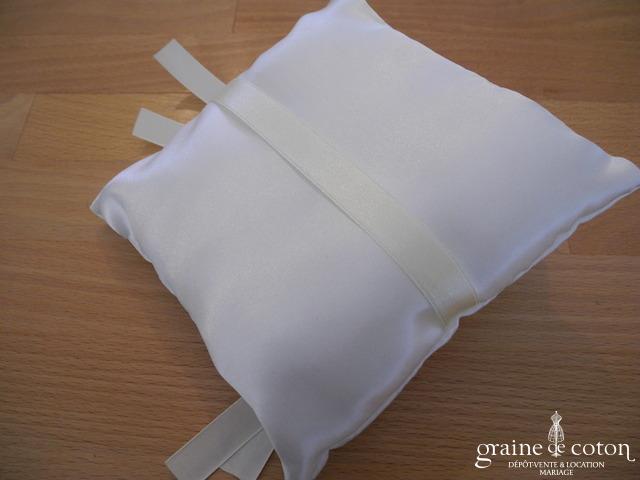 Coussin d’alliances en satin blanc avec noeud. Deux rubans d’organza pour nouer les alliances.