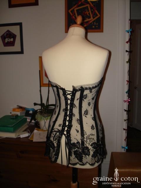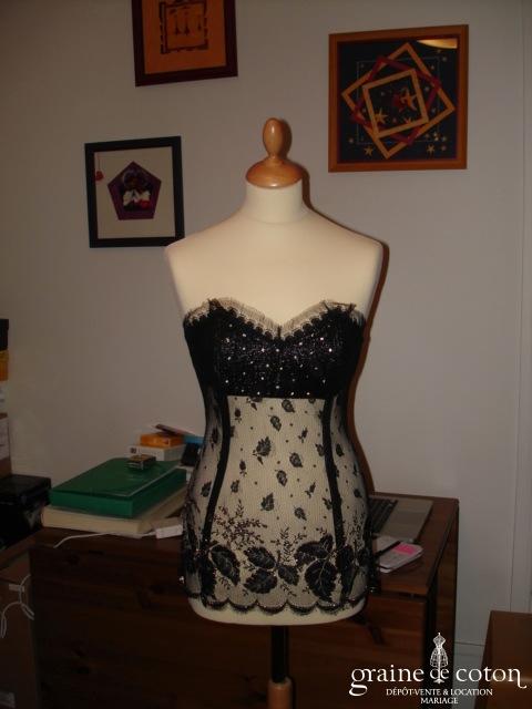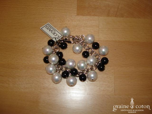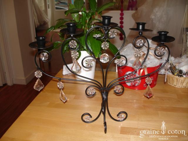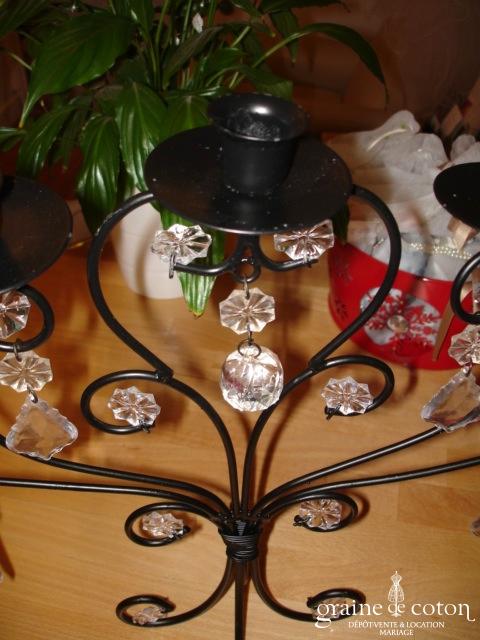 Chandelier à 5 bougeoirs, noir avec des pampilles transparentes façon cristal. Hauteur maximale sans bougie : 35 cm. Envergure : 43 cm. Idéal pour des centres de tables baroques.