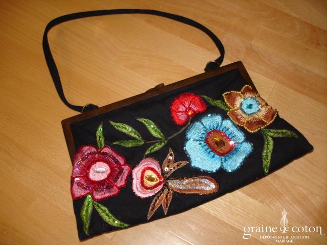 Petit sac pochette en coton noir brodé de fleurs de couleur