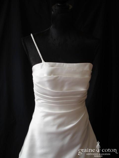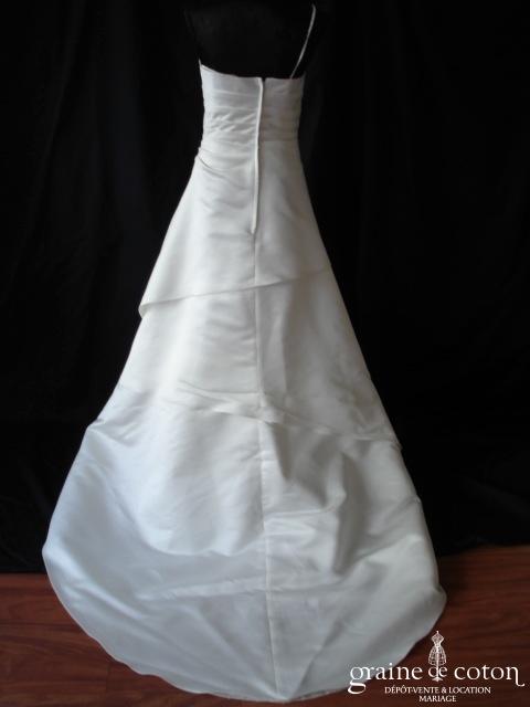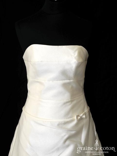 Robe une pièce ivoire clair : bustier coeur tout en dentelle, dos boutonnée. Taille haute ceinturée puis jupe boule en mikado épuré, largement évasée avec traîne. Poches. Une robe de …
