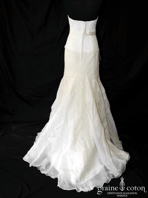 Robe une pièce ivoire clair : top en dentelle délicatement perlée, encolure bateau et dos nu. Jupe taille haute en tulle et dentelle fluide, longue traîne. Somptueuse et lumineuse.