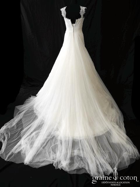 Robe une pièce en tulle et dentelle ivoire clair : top décolleté coeur, délicatement perlé et dos échancré puis boutonné. Jupe taille haute évasée tout en fluidité, rappel de dentelle …