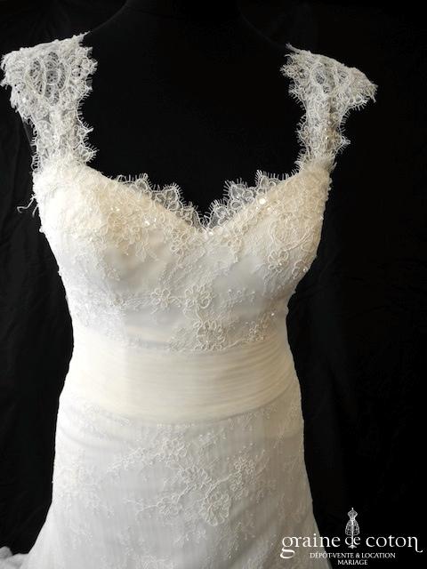 Robe une pièce tout en dentelle ivoire clair : top à fines bretelles, décolleté coeur devant et grand dos nu en V. Jupe sirène avec traîne pouvant se relever, finition …