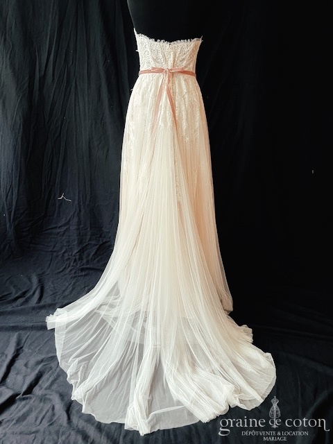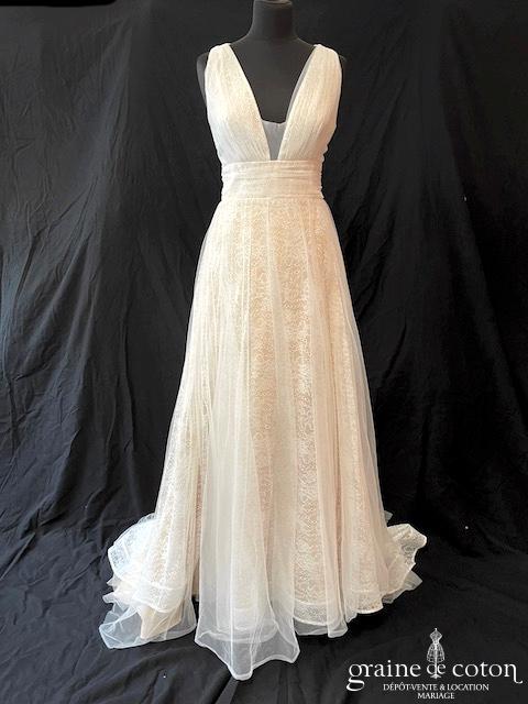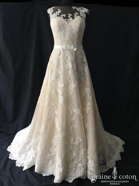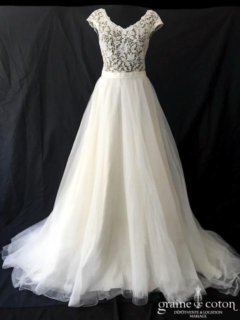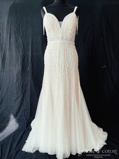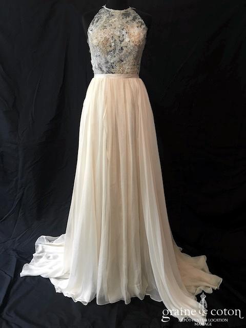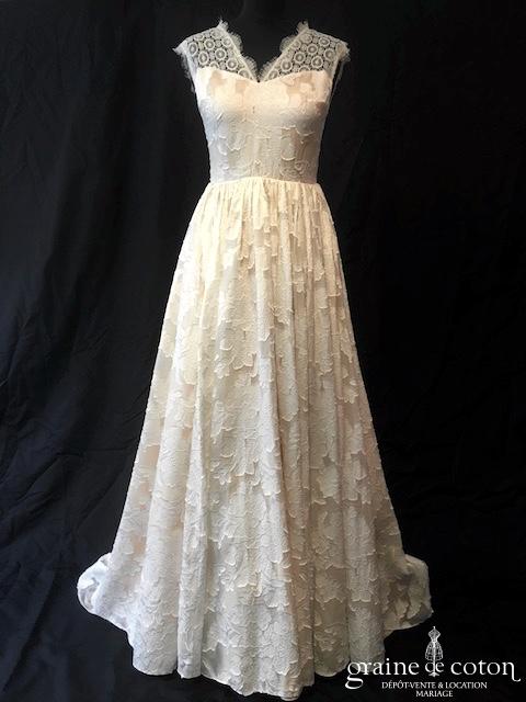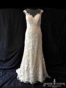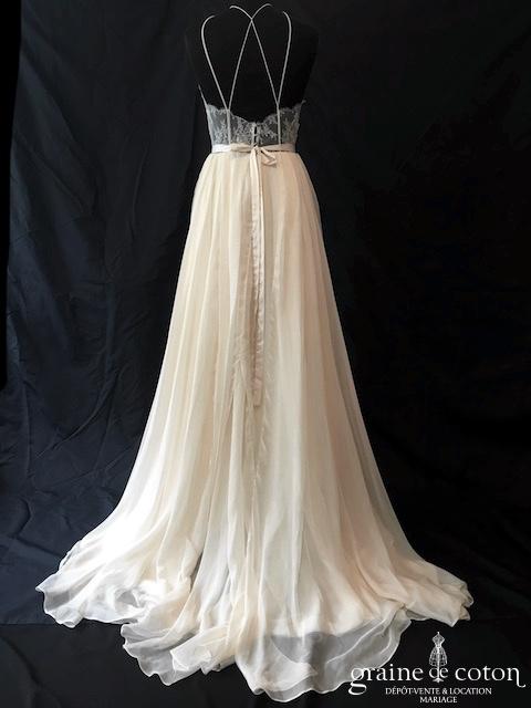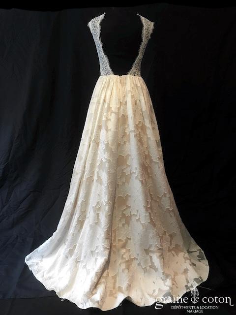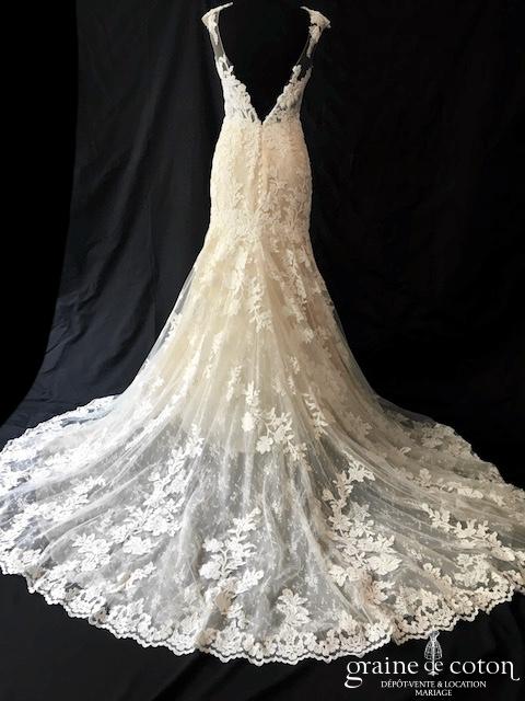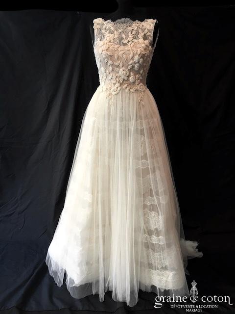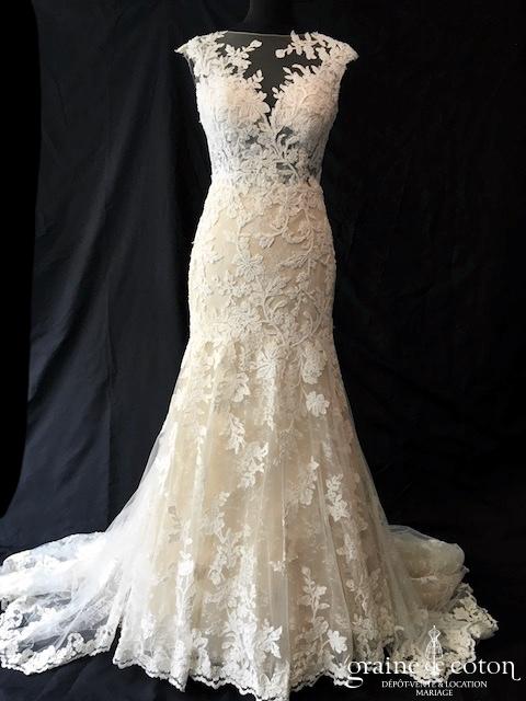 Dépôt d’une robe sirène nude et ivoire, en broderie et dos boutonné. Elégante et glamour. Taille 36-38, référence 5499.