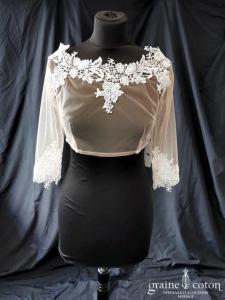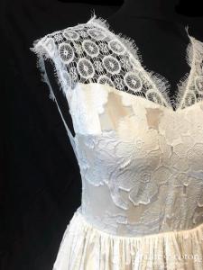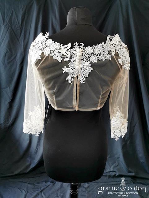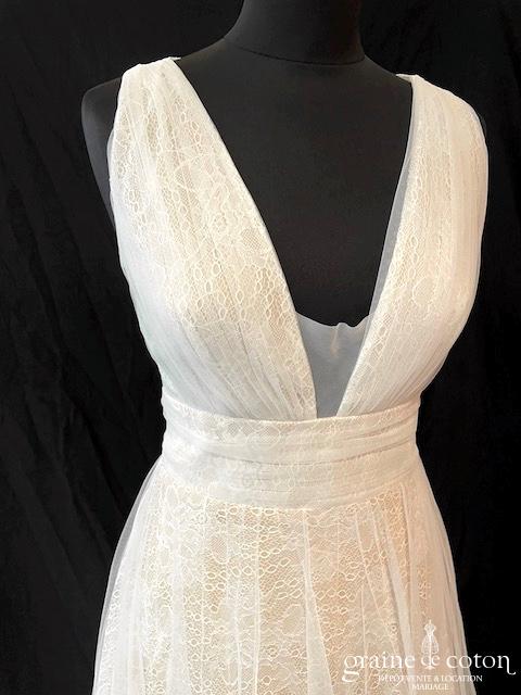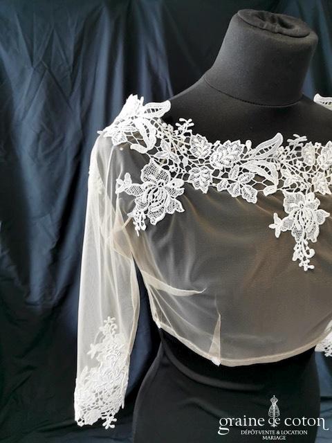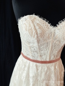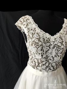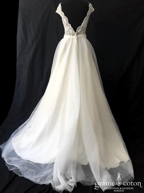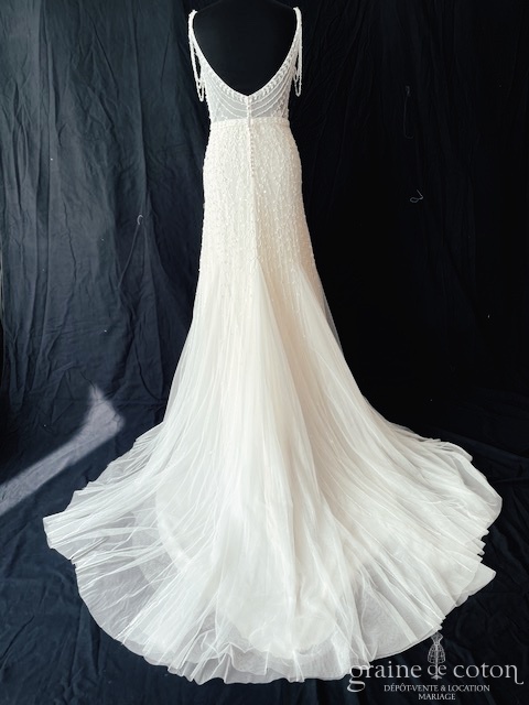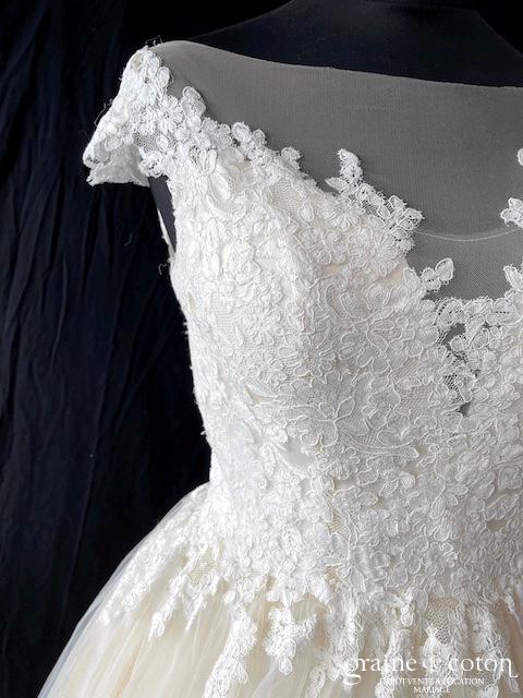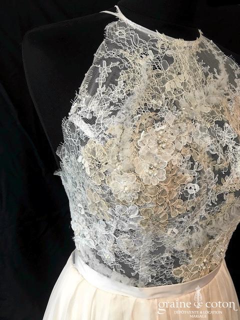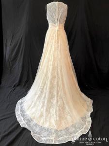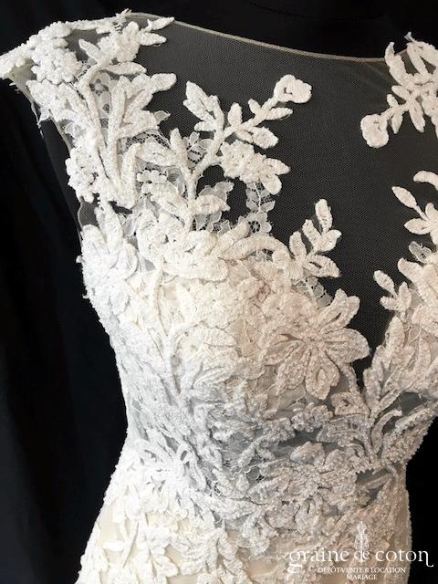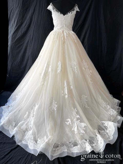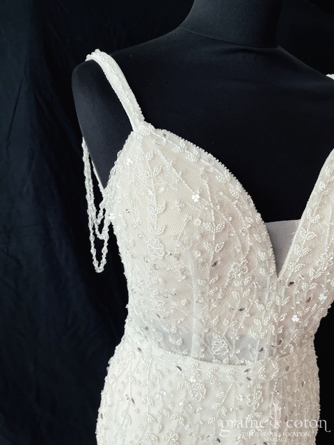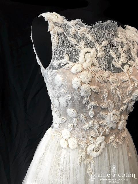 Dépôt d’une robe sirène nude et ivoire, en broderie et dos boutonné. Elégante et glamour. Taille 36-38, référence 5499.