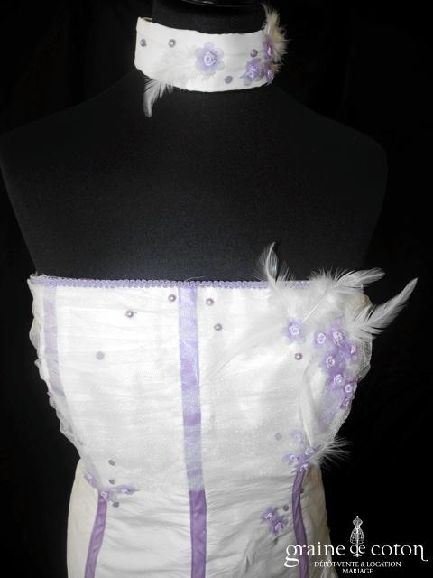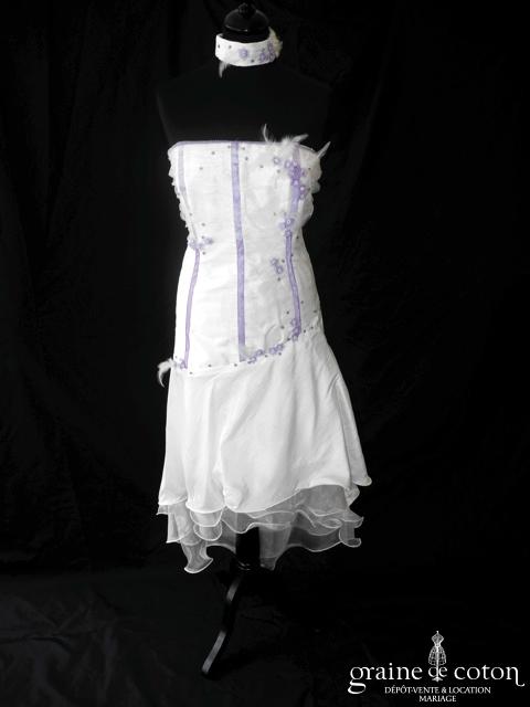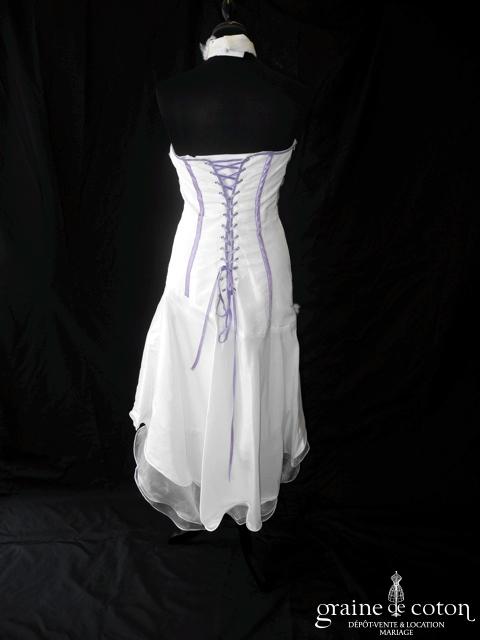 Robe de cortège ou de soirée fluide, mi-longue (mollets) et fendue jusqu’au genou. Fines bretelles se laçant dans le dos.