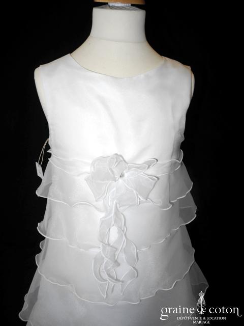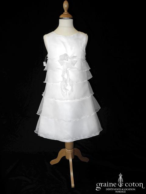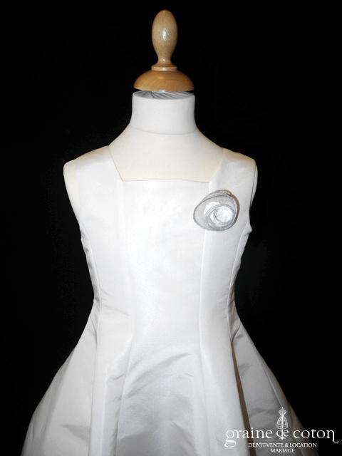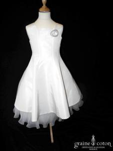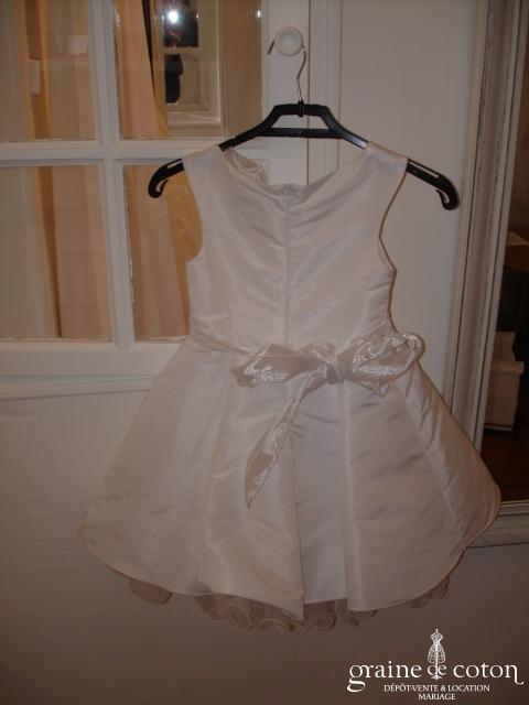 Robe petite fille en deux parties jupon en organza volanté ivoire et argenté, sur robe en taffetas ivoire.
