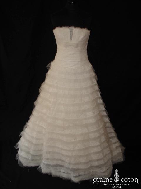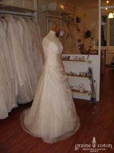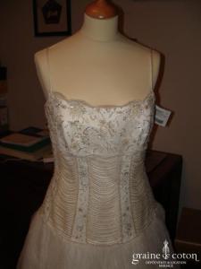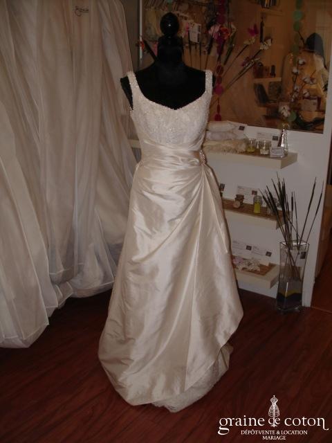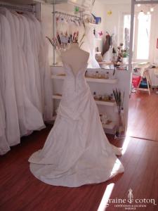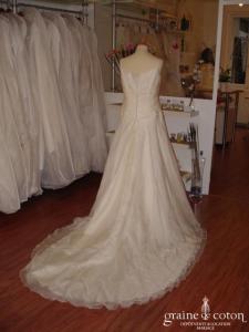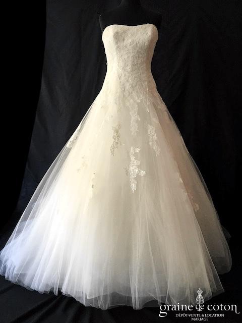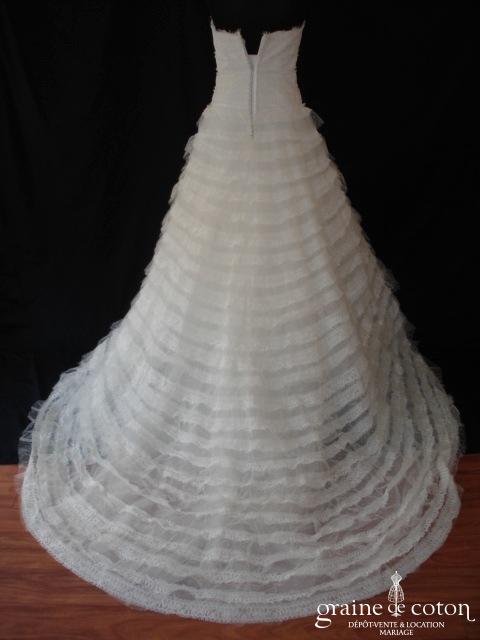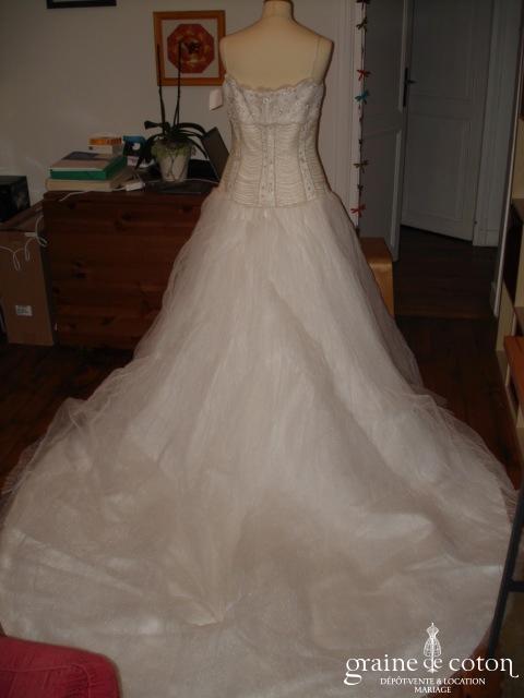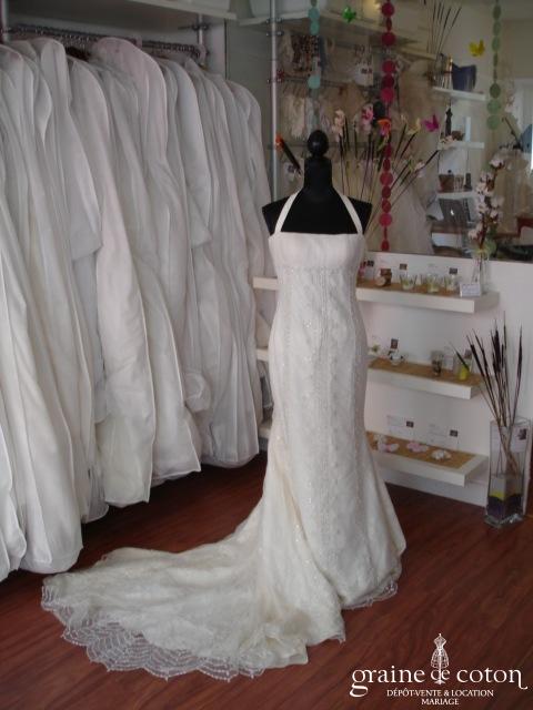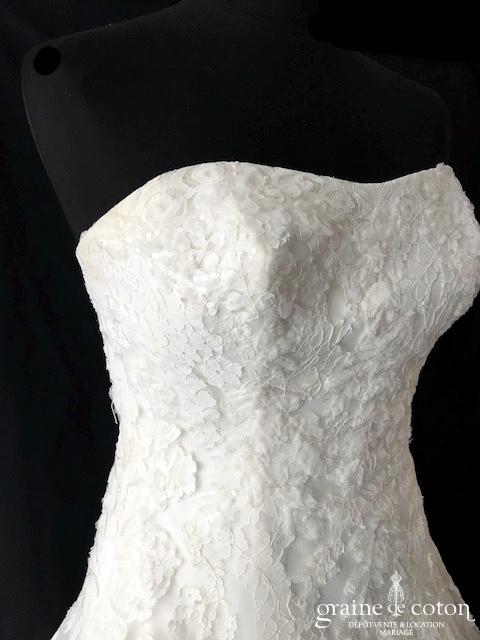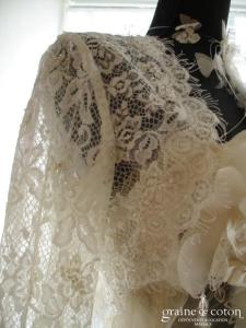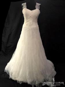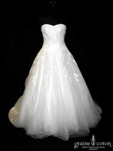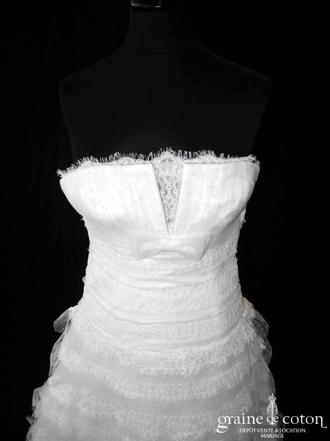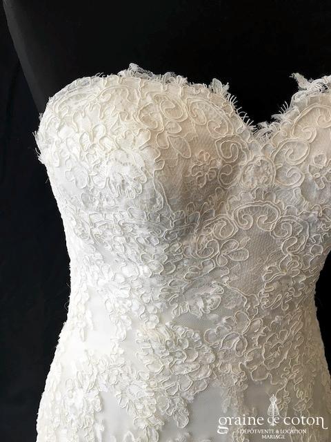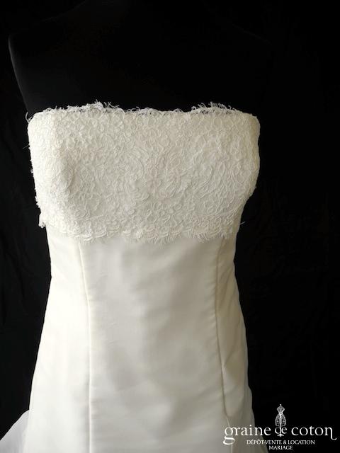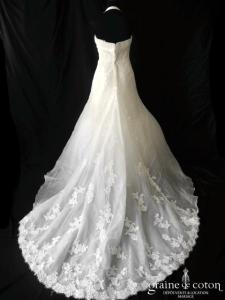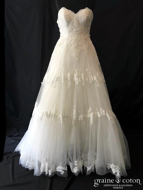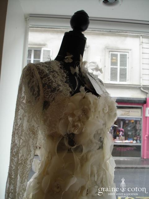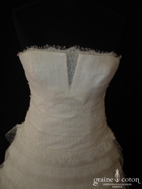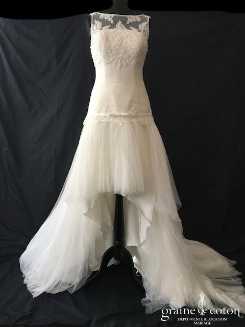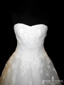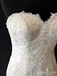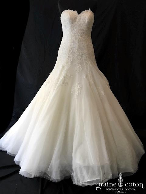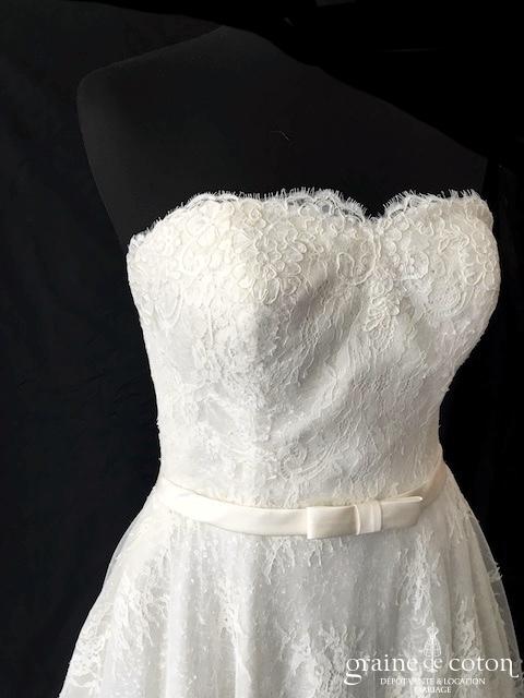 Robe une pièce ivoire clair : bustier coeur tut en dentelle, dos boutonné. Taille taille basse, évasée en tulle avec rappel de guipure de dentelle, traîne. Raffinée, élégante et lumineuse. …