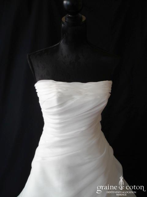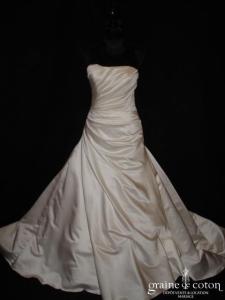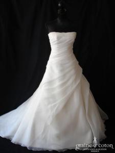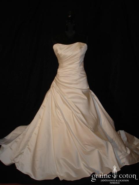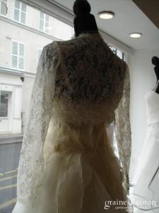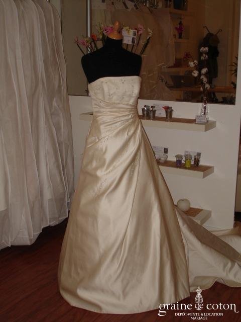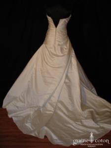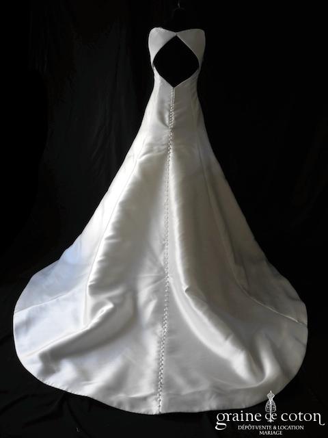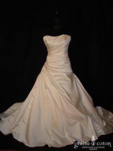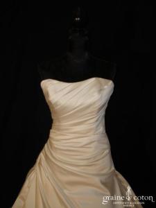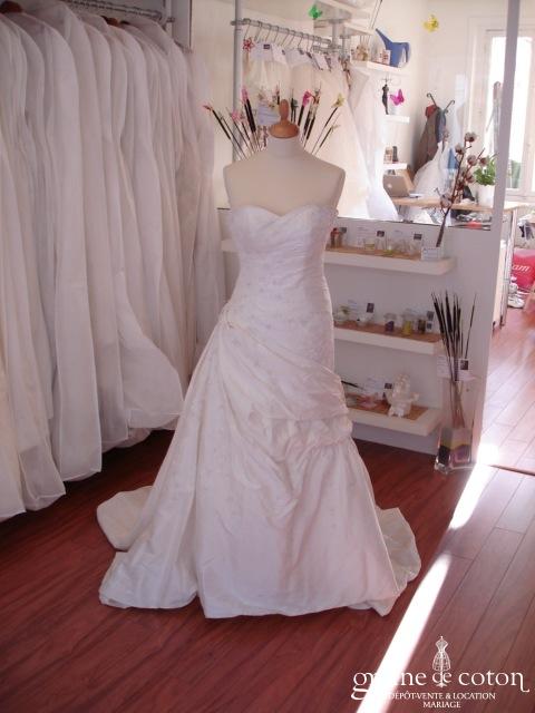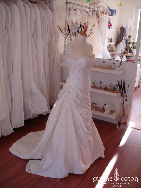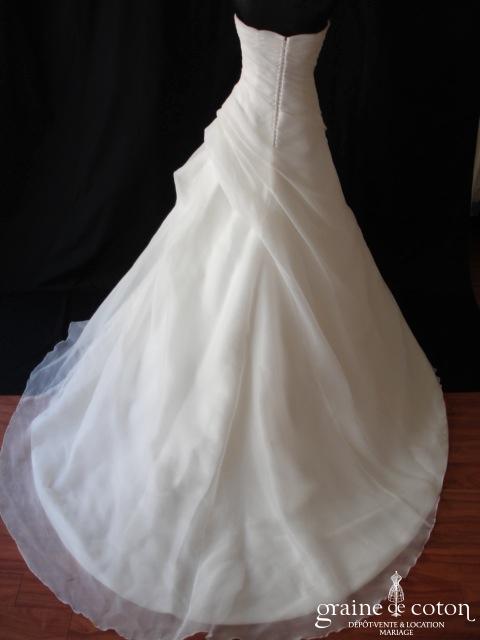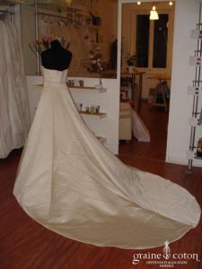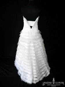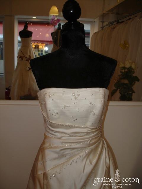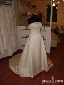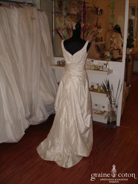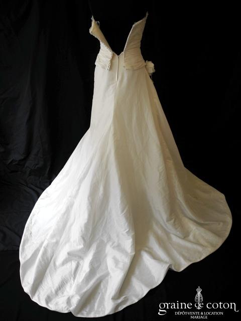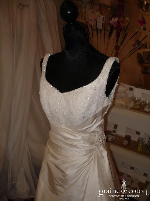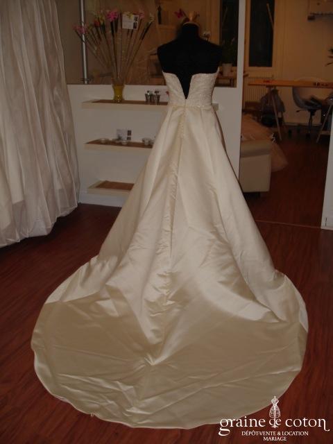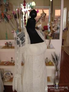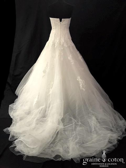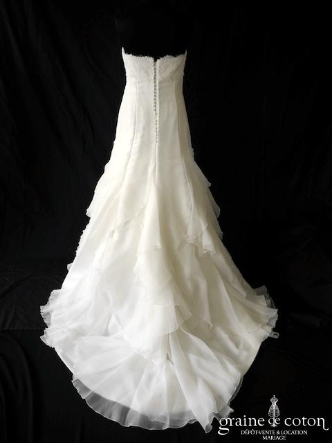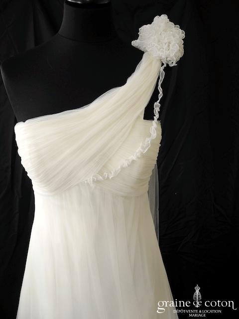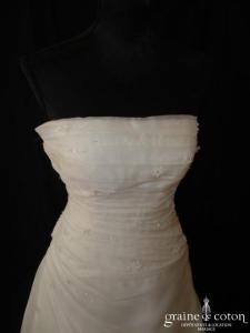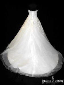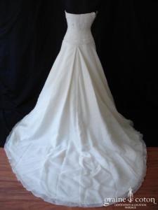 Robe une pièce ivoire clair : bustier coeur tut en dentelle, dos boutonné. Taille taille basse, évasée en tulle avec rappel de guipure de dentelle, traîne. Raffinée, élégante et lumineuse. …