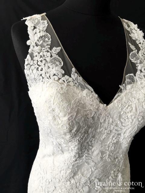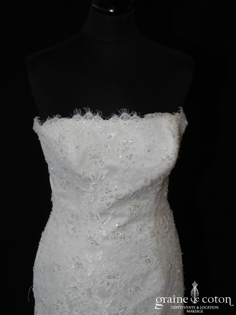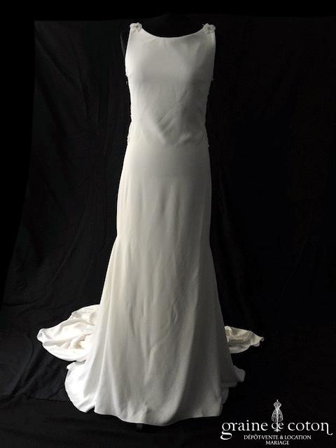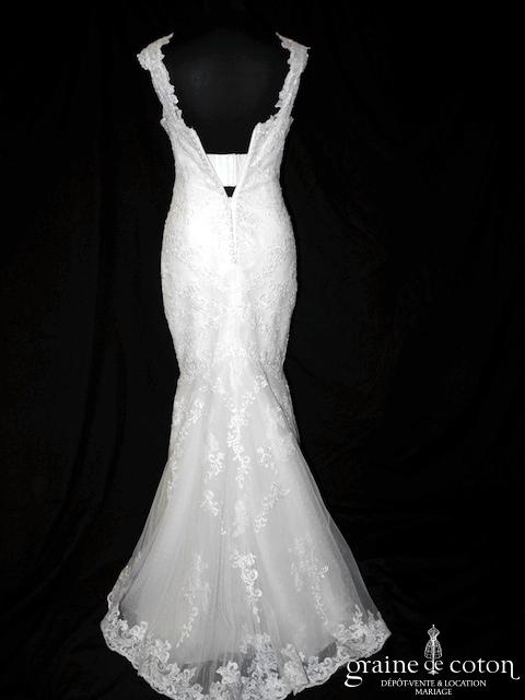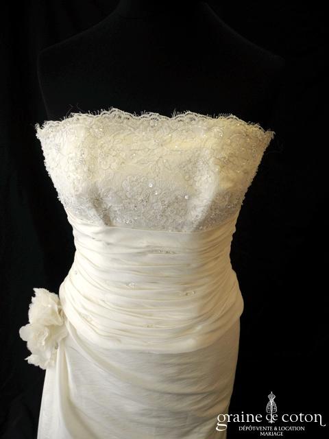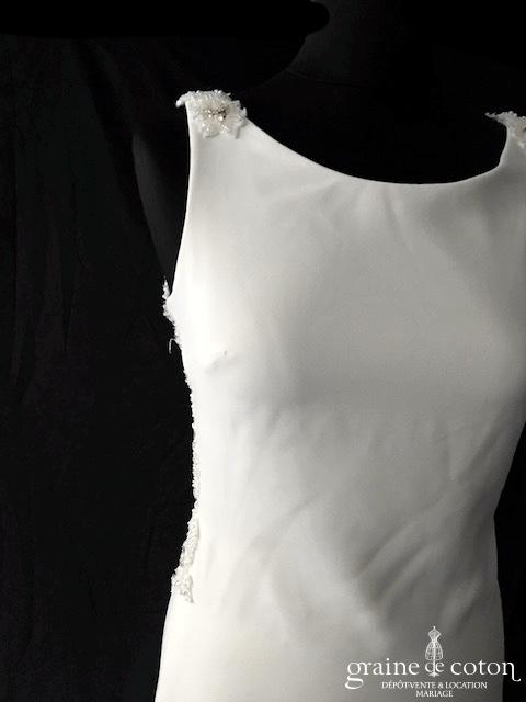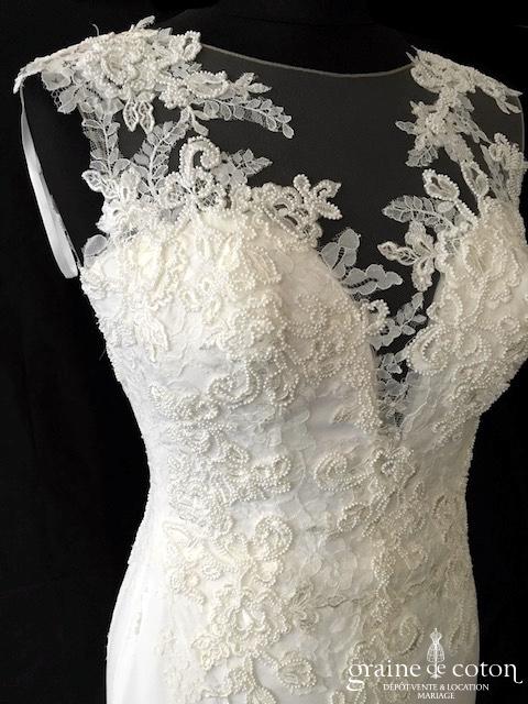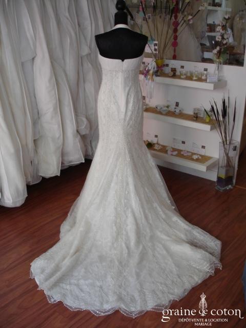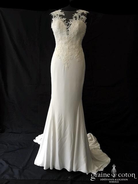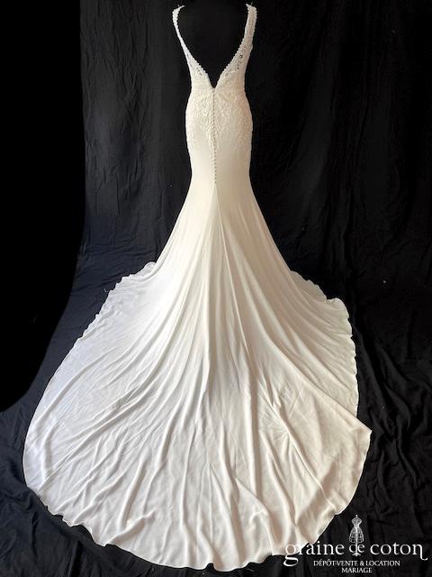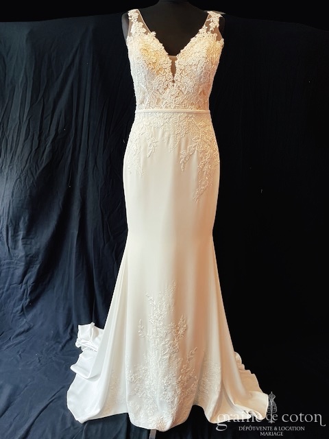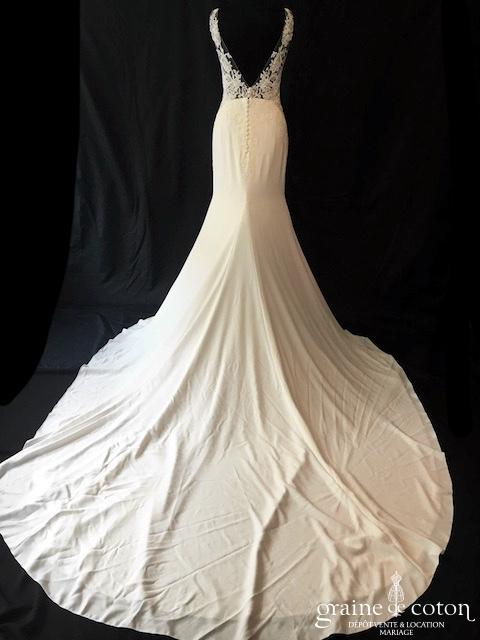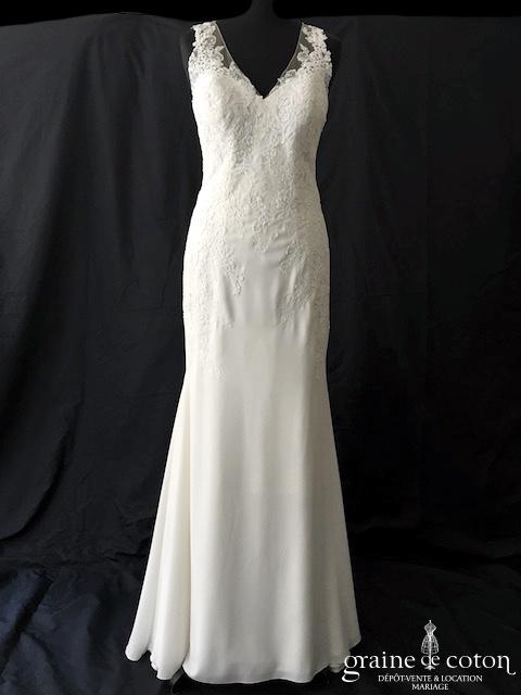 Robe une pièce en crêpe et dentelle délicatement perlée ivoire clair : top décolleté V avec bretelles, dos nu puis boutonné. Empiècements en dentelle transparente sur les hanches. Jupe sirène …