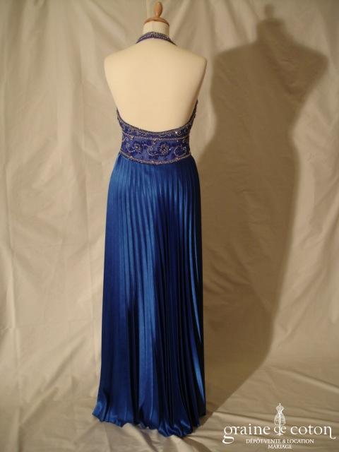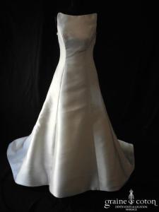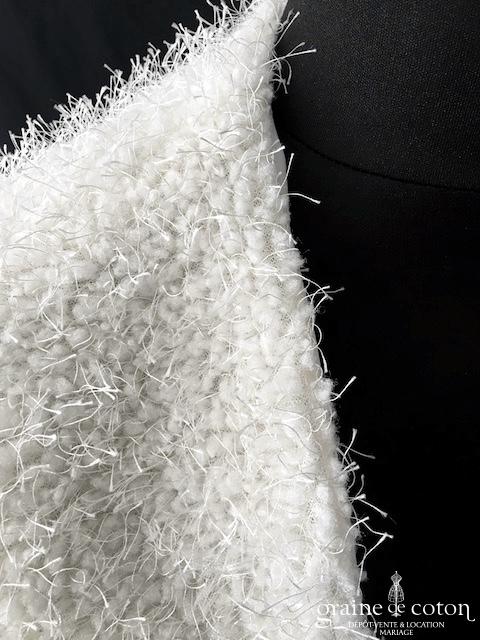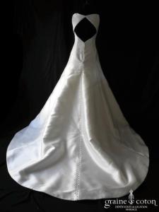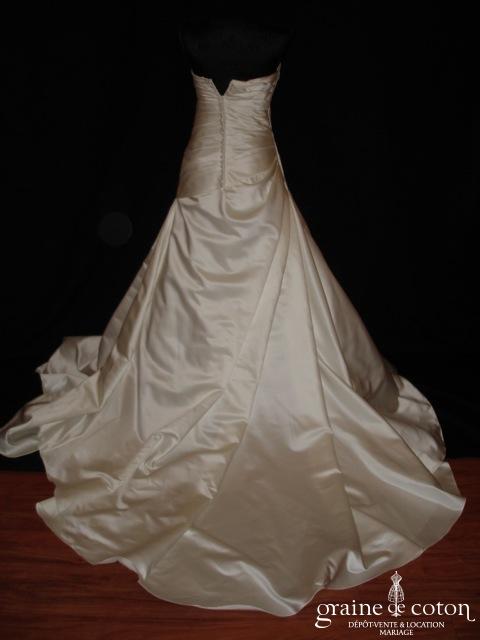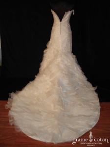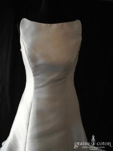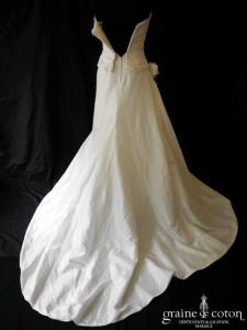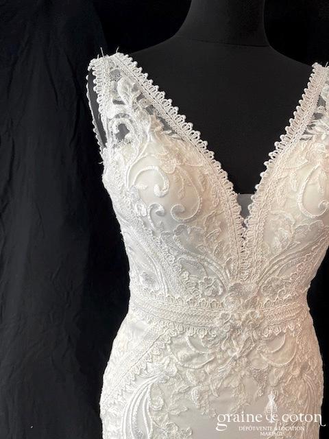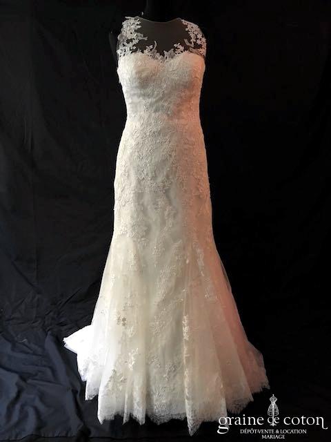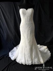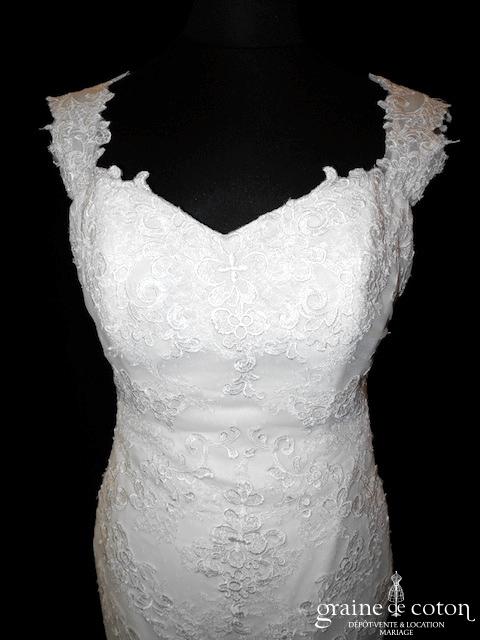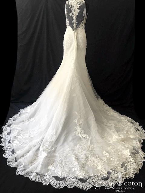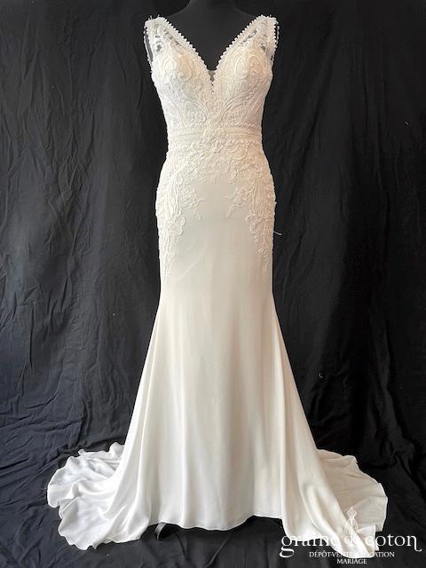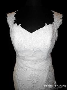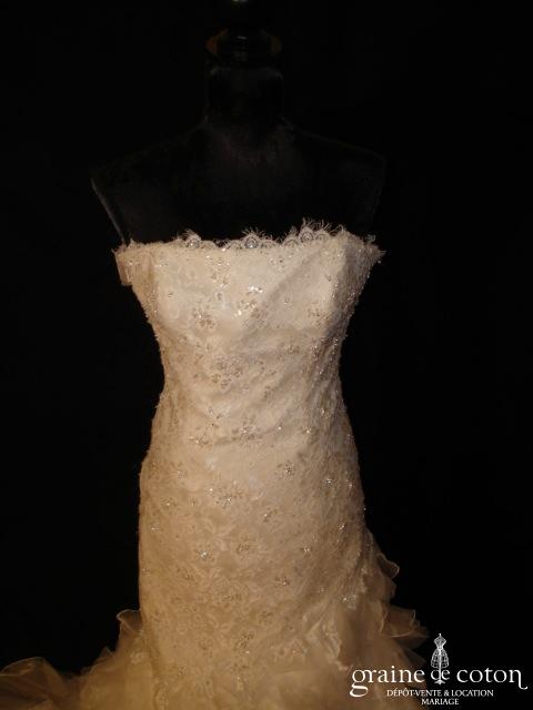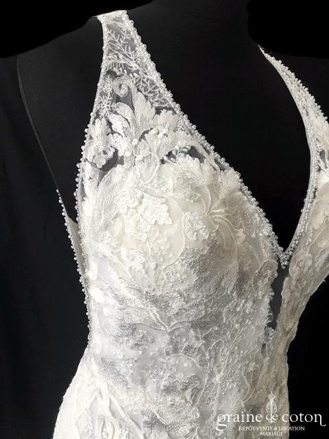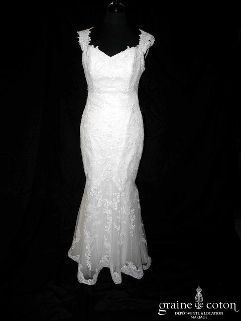 Robe une pièce en crêpe et dentelle délicatement perlée ivoire clair : top décolleté V avec bretelles, dos nu puis boutonné. Empiècements en dentelle transparente sur les hanches. Jupe sirène …
