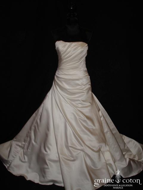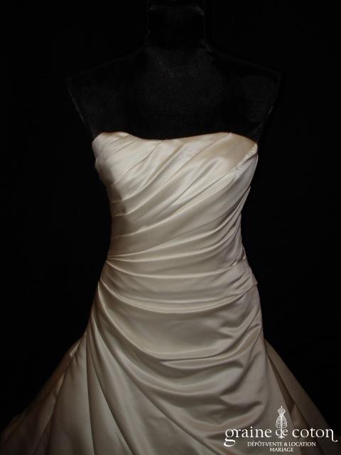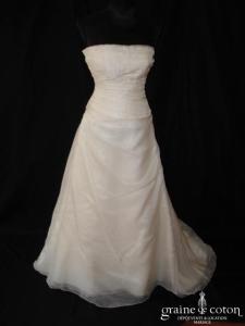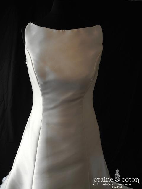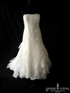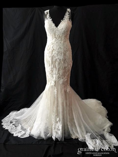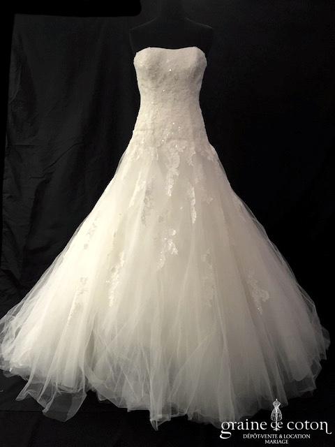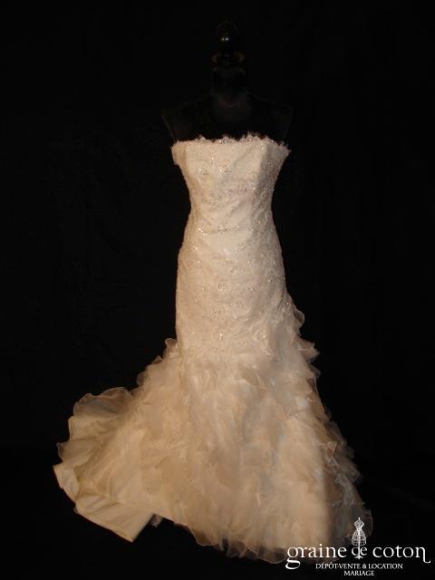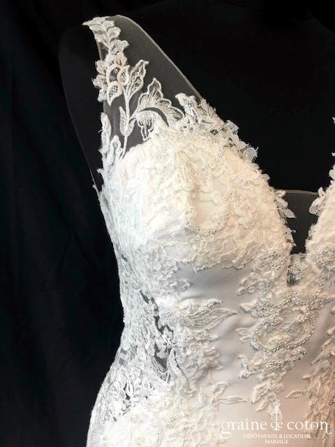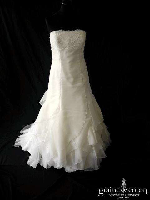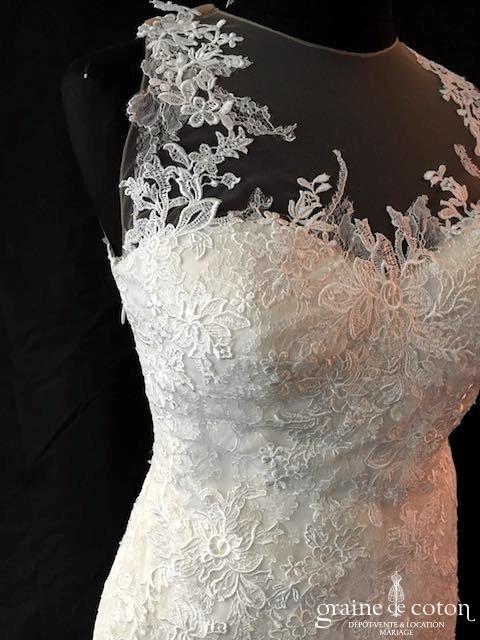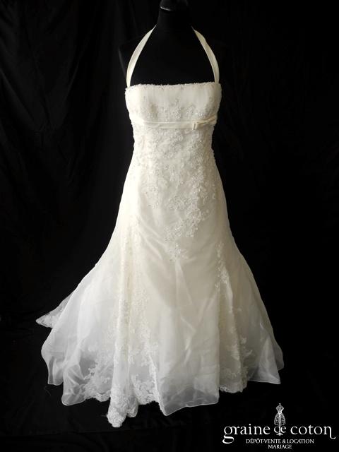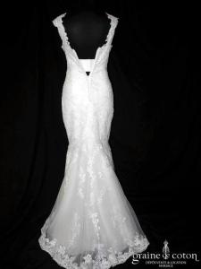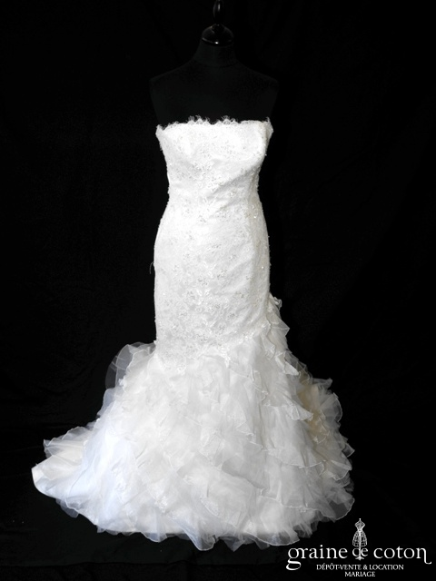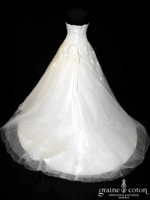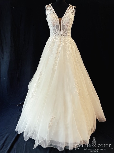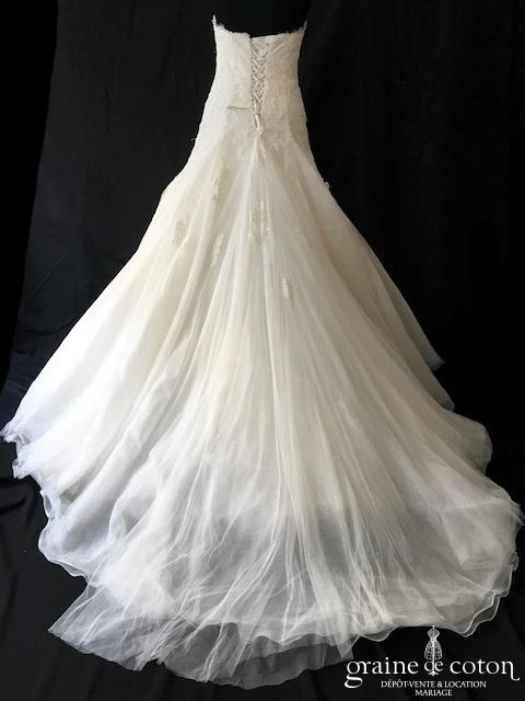 Robe une pièce ivoire clair et fond de robe nude : bustier avec bretelles, décolleté en V et dos nu recouvert de dentelle. Jupe sirène en tulle fluide et dentelle …