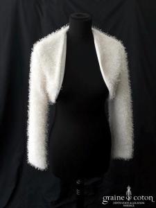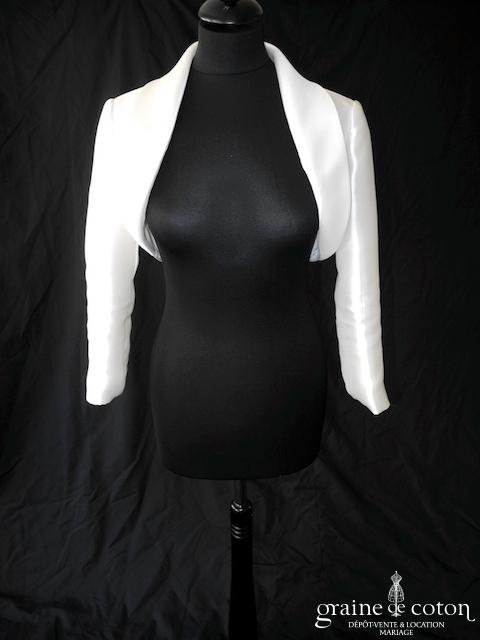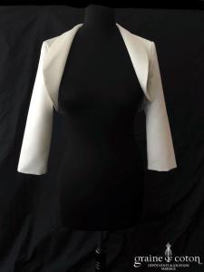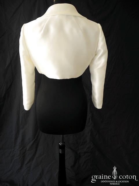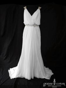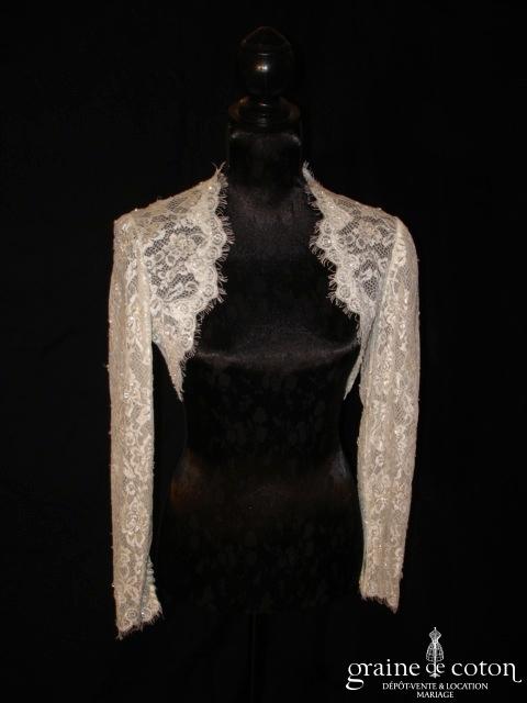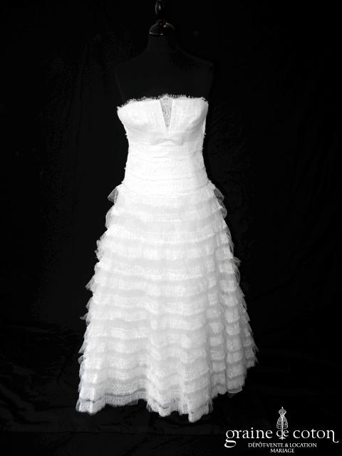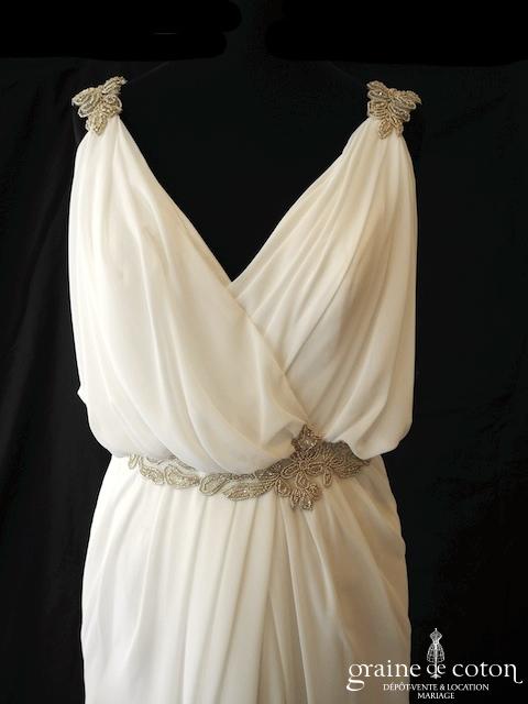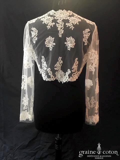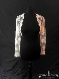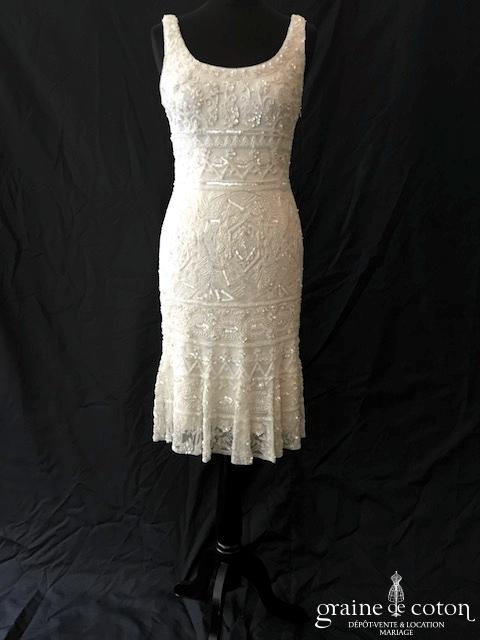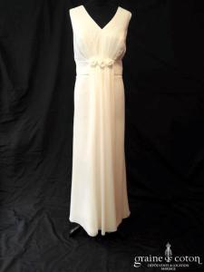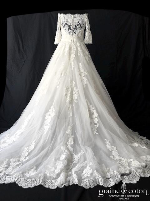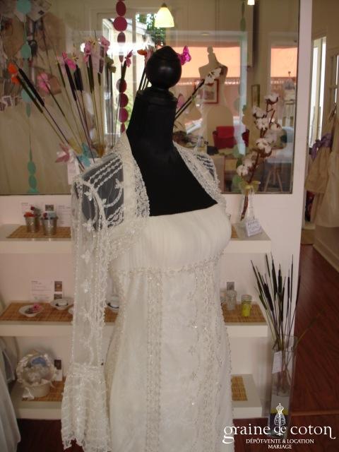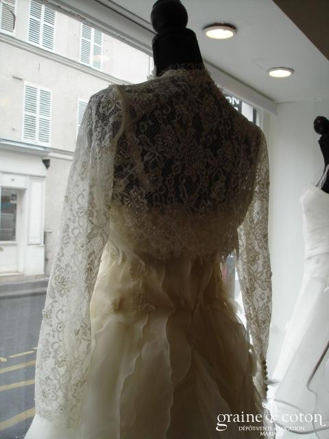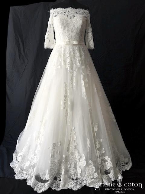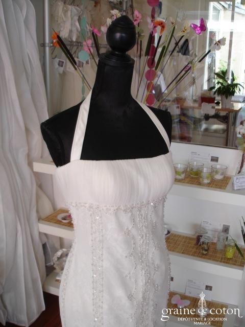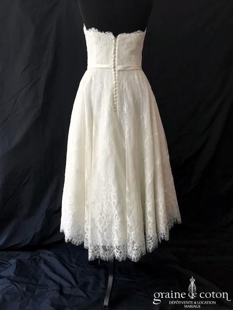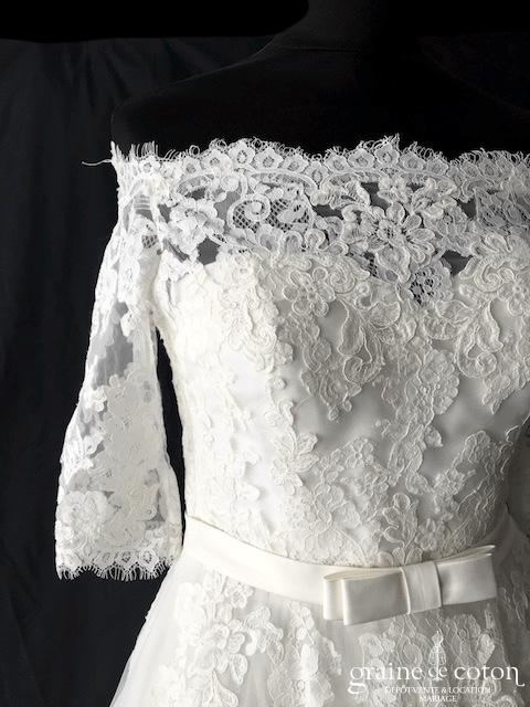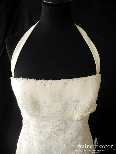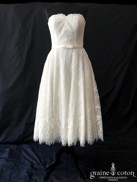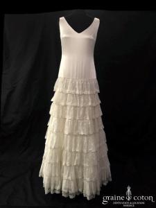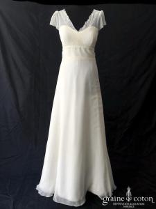 Robe une pièce ivoire calir : top encolure carrée avec manches longues ballon style 1900, en dentelle délicatement perlée. Jupe taille haute avec large empiècement effet empire, coupe princesse, en …
