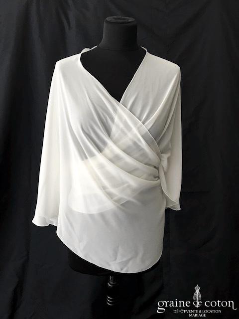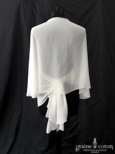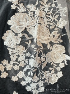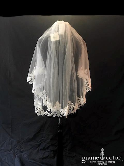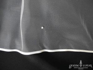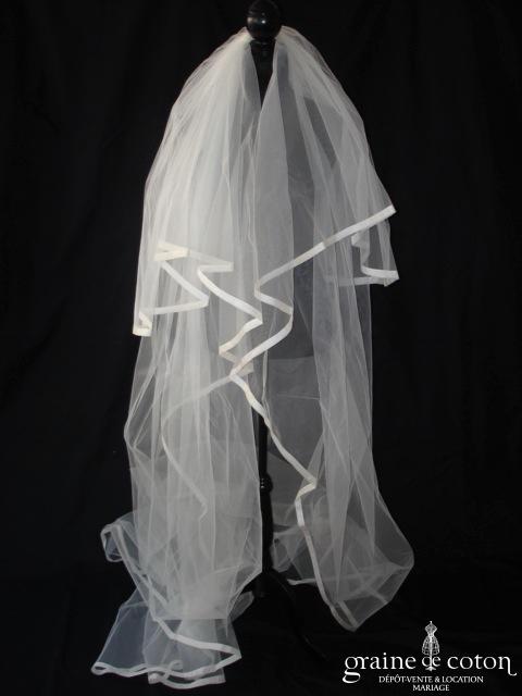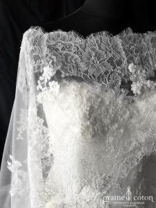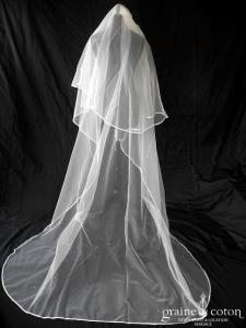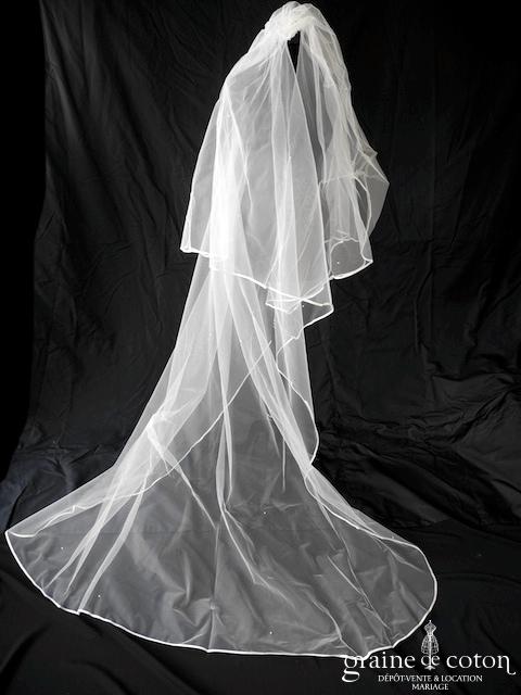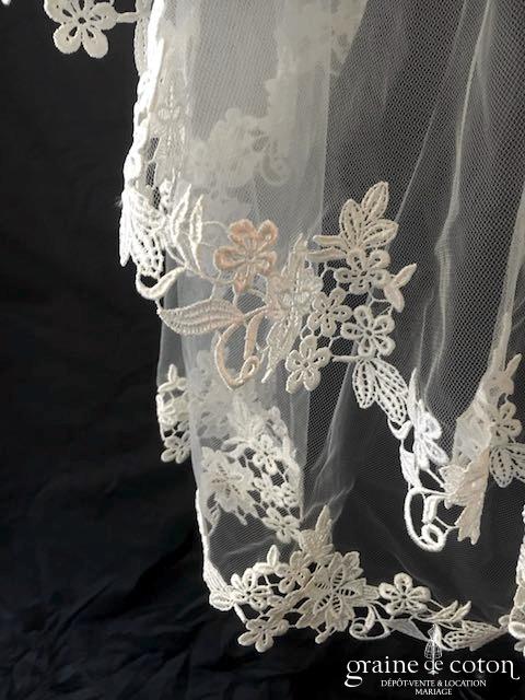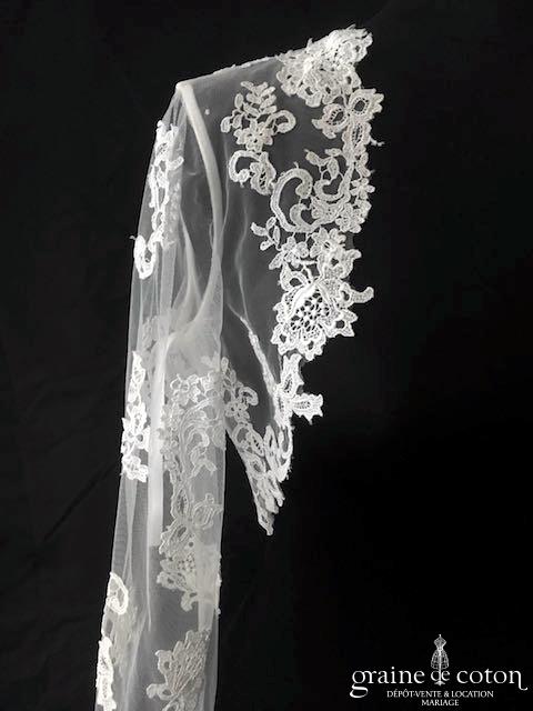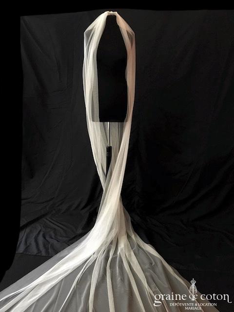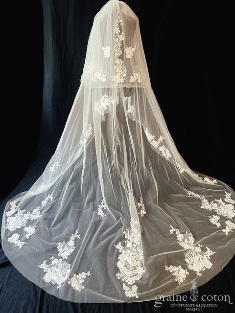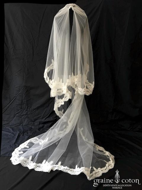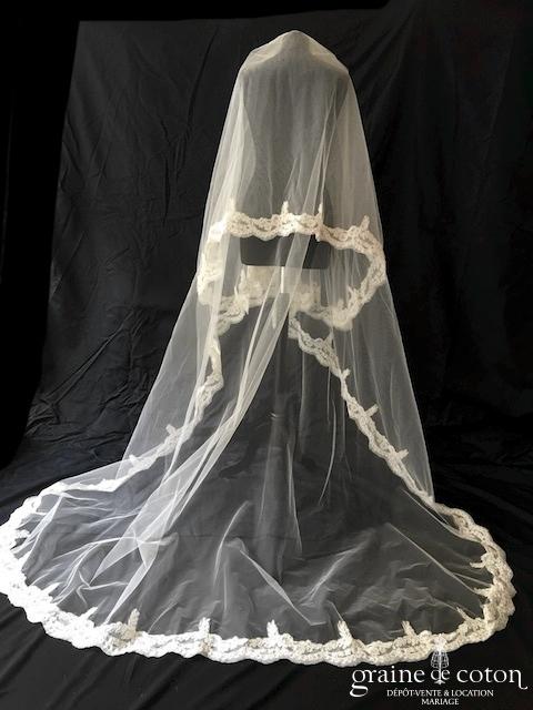 Voile long de 3 mètres en tulle fluide ivoire bordé de dentelle. Monté sur peigne, avec rabat.