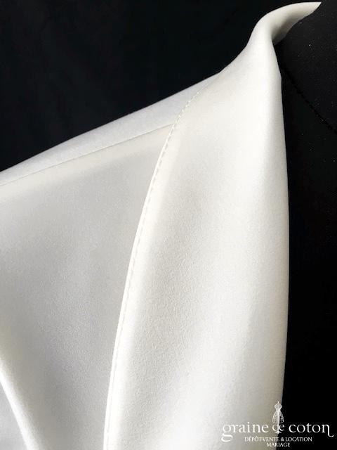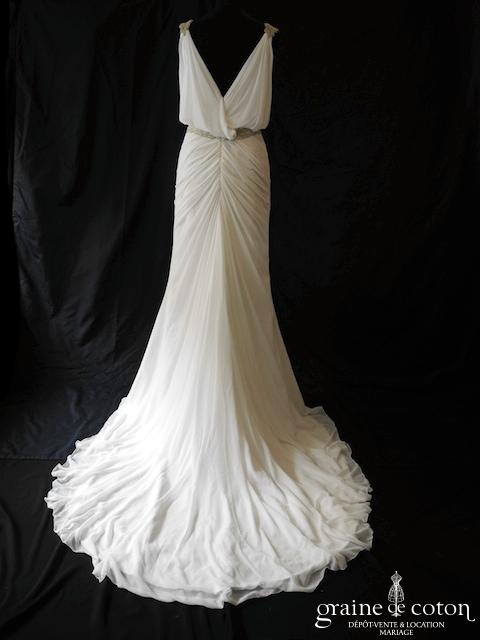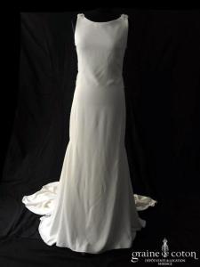 Robe une pièce ivoire clair : top à larges bretelles et décolleté en V, dos nu. Jupe sirène en crêpe fluide ivoire clair, épurée avec longue traîne. Glamour et lumineuse. …