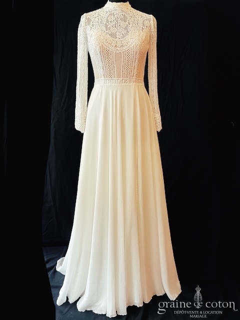 Robe une pièce ivoire clair : top en dentelle avec col montant et manches longues, dos entièrement boutonné. Jupe taille haute fluide en mousseline, fendue, longue traîne. Élégante, chic et …