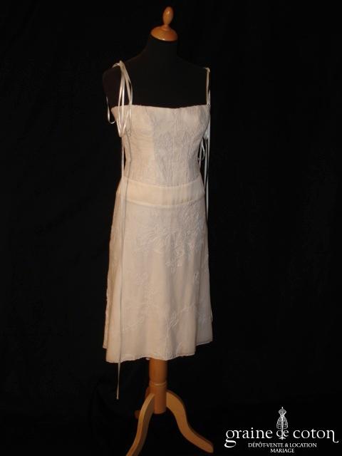 Robe courte ivoire en voile de coton brodé ancien (le tissu date de 1915) et dentelle de cornélie. Dos lacé et bretelles en rubans de satin ajustables. Idéale pour une …