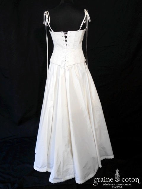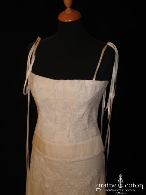 Robe une pièce ivoire : bustier en bandes horizontales de satin, soie sauvage, dentelle de calais et dentelle de chantilly, jupe trapèze en triple organza de soie. Dos lacé, bretelles …