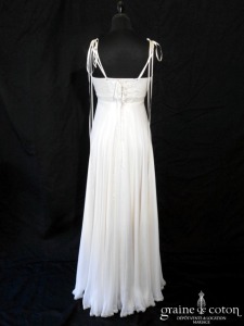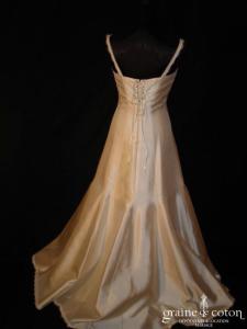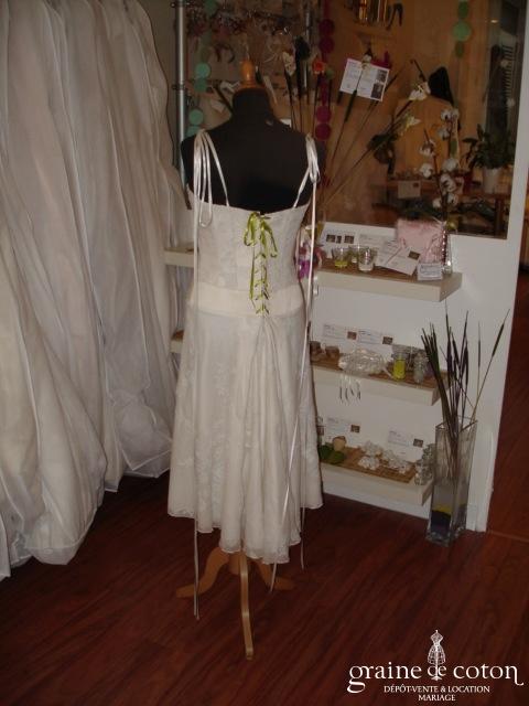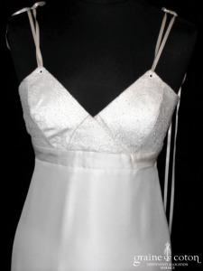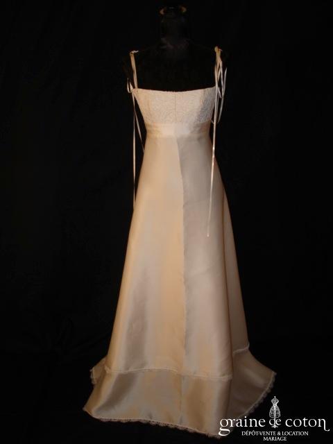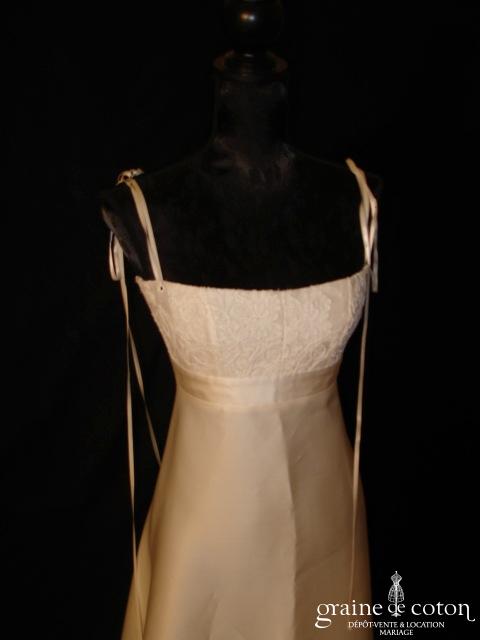 Robe une pièce taille empire : décolleté en V en dentelle de calais ivoire et dorée, dos lacé et bretelles en longs rubans de satin ajustables. Jupe trapèze fluide en …