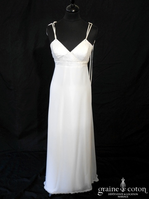 Robe une pièce taille empire en dentelle de calais. Dos lacé et bretelles en longs rubans de satin ajustables. Magnifique dentelle, coupe simple et efficace.