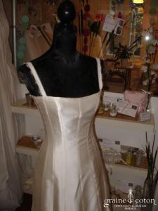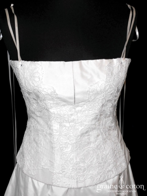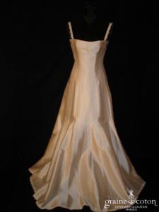 Robe une pièce en mikado de soie ivoire, bordée d’un galon de dentelle de chantilly, bretelles, dos lacé. Simplicité et élégance pour cette robe à la coupe sirène, belles matières. …