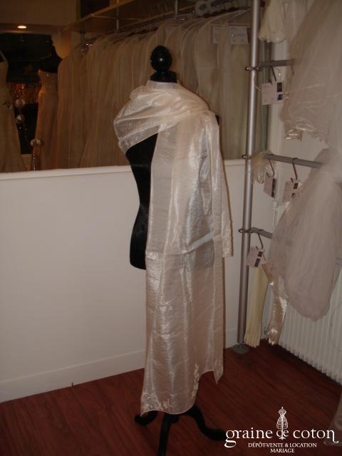 Étole en organza froissé, couleur champagne. Perles très discrètes brodées en petit motif aux extrémités. Longueur de plus de 2 mètres, idéale pour s’en faire un cache coeur.