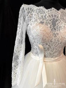 Boléro en tulle bordé de dentelle perlée ivoire à manches courtes, ouvert sur l’avant, idéal pour couvrir les épaules sans cacher la robe.