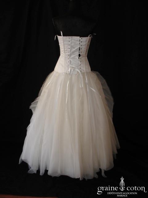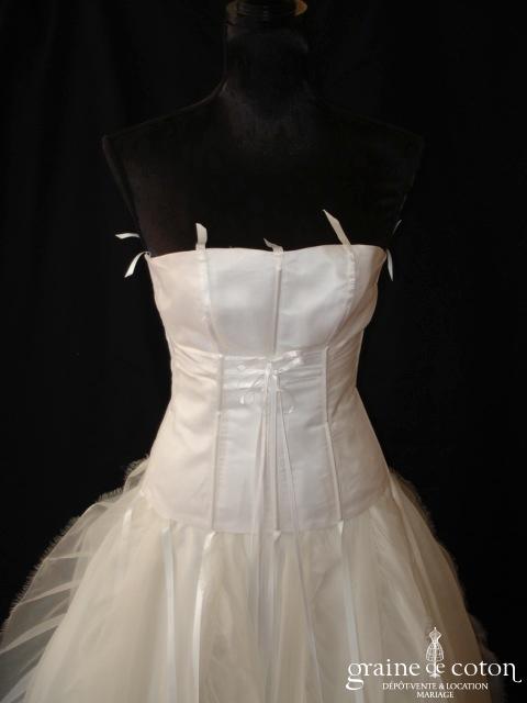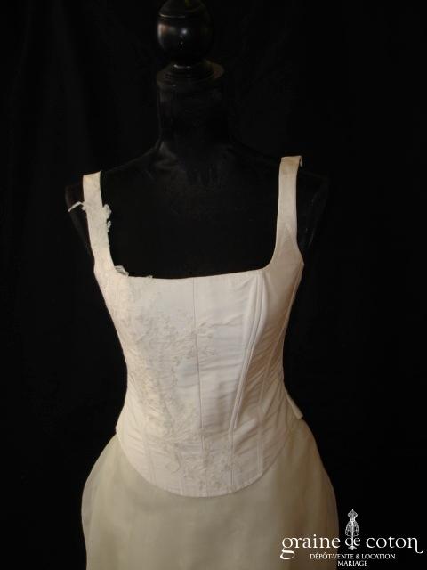 Robe deux pièces ivoire : bustier taille basse lacé dans le dos, recouvert d’organza de soie et avec de multiples rubans de satin. Jupe avec mouchoirs d’organza, voluptueuse et légère. …