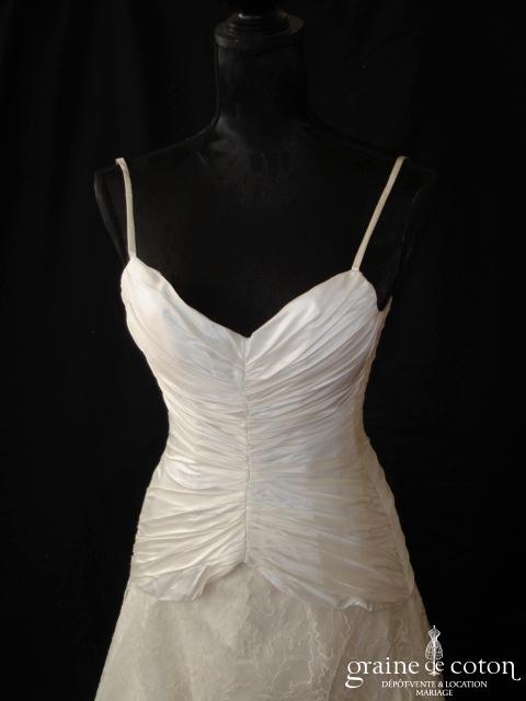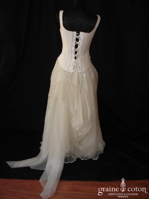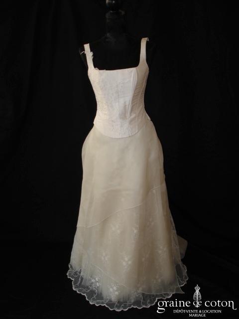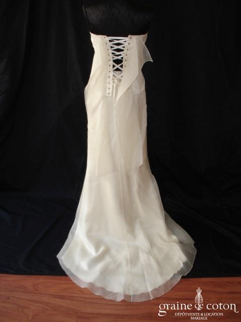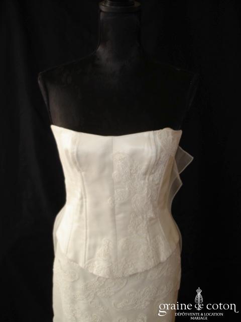 Robe deux pièces en organza de soie ivoire et dentelle : bustier lacé dans le dos avec pans d’organza, jupe sirène avec guipure de dentelle. Sobre, élégant, grande qualité.