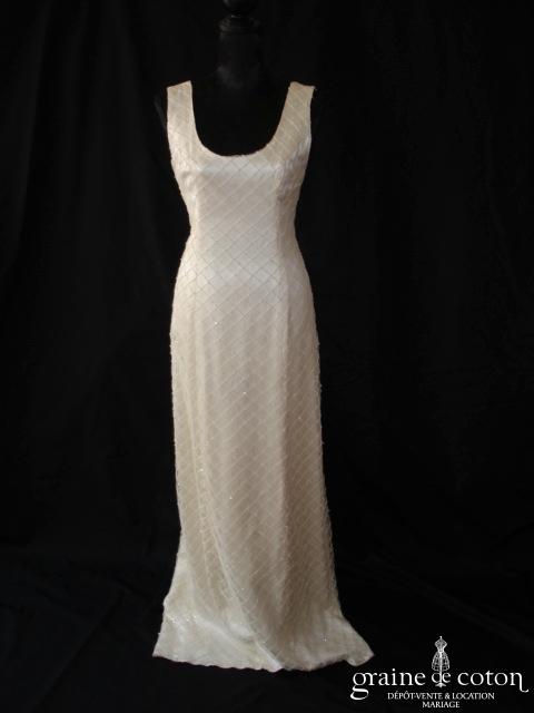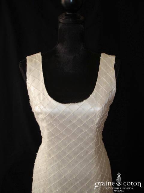 Robe une pièce ivoire avec bretelles, en satin de soie recouvert de tulle pailleté. Devant classique et dos largement décolleté avec drapé de satin de soie en guise de traîne. …