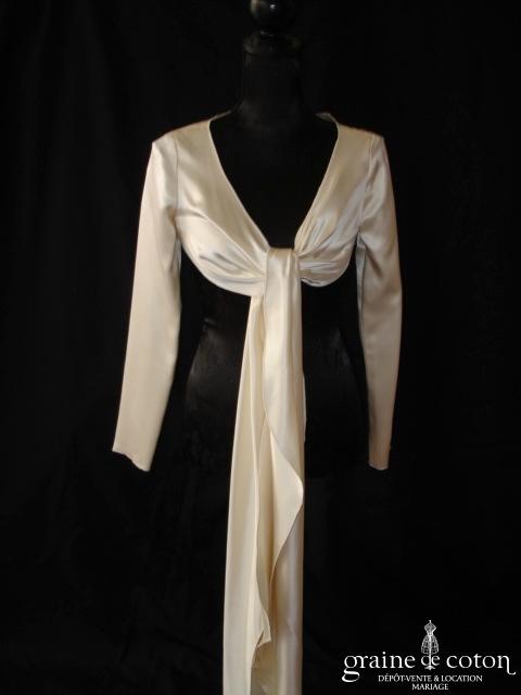 Boléro court en satin de soie ivoire, se nouant sur l’avant ou bien en cache coeur croisé sur l’arrière.
