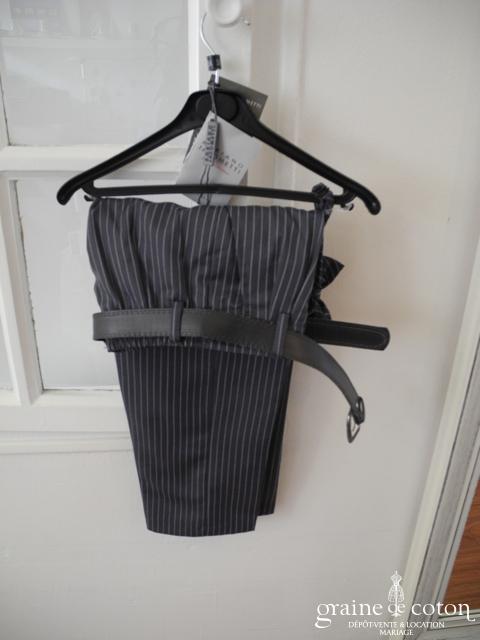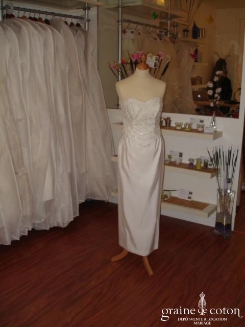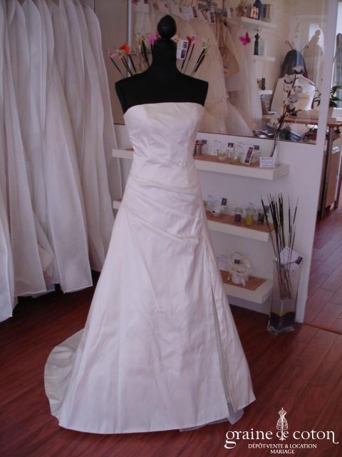 Robe trois pièces entièrement en soie sauvage ivoire : bustier plissé à la taille, jupe s’ouvrant sur un pan de tulle et boléro asymétrique parfaitement assortis. Petite traîne. Simple et …