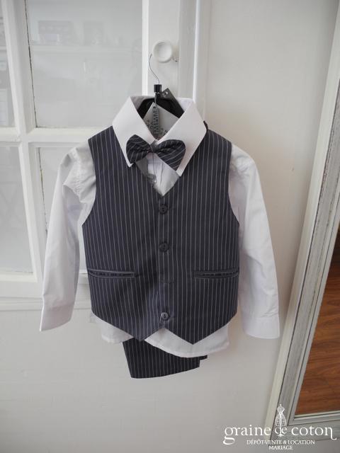 Costume 5 pièces petit garçon gris : pantalon taille élastique, chemise, gilet, veste et cravate violette. Adorable et complet !