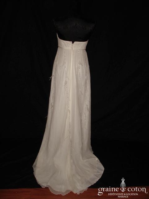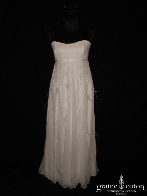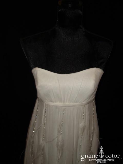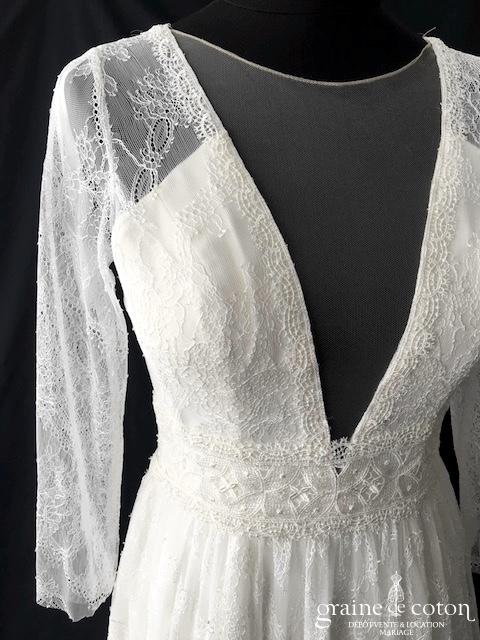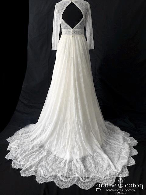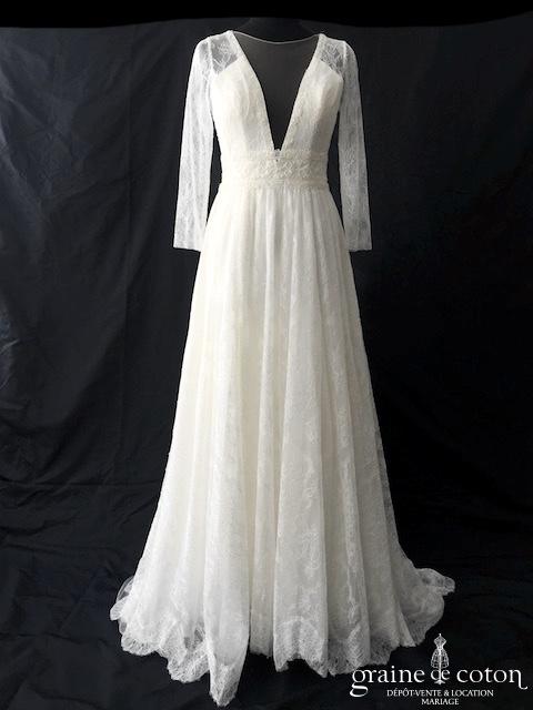 Robe une pièce en dentelle ivoire clair : top décolleté profond en V, manches 3/4 et dos losange. Jupe taille haute fluide avec longue traîne. Bohème chic, raffinée et légère. …