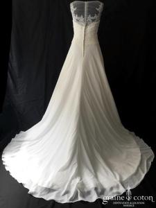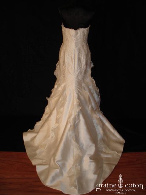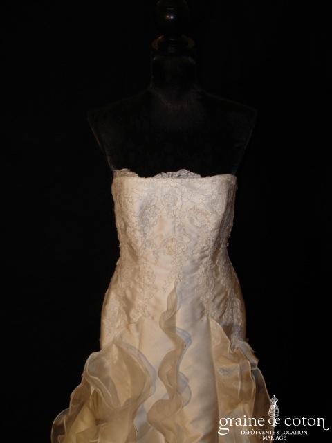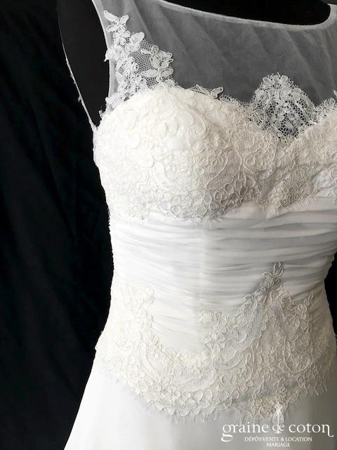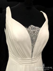 Robe une pièce ivoire clair : bustier coeur drapé avec guipure de dentelle, bretelles en tulle recouvrant le décolleté, dos boutonné. Jupe légèrement taille basse en mousseline fluide, petite traîne. …