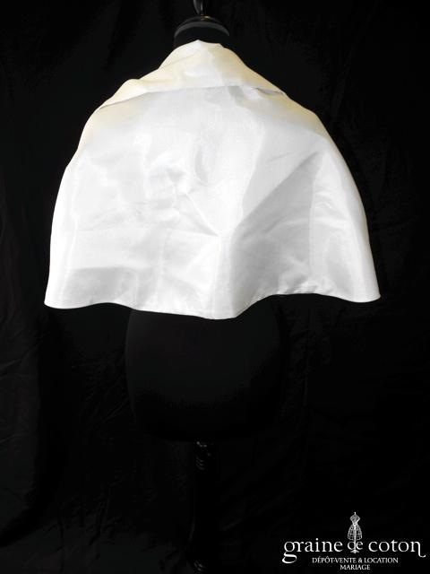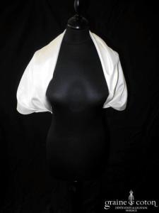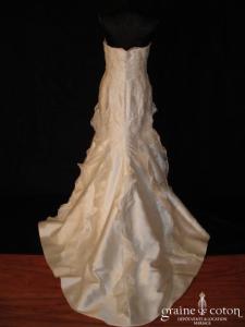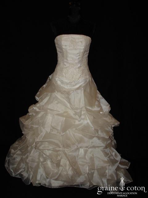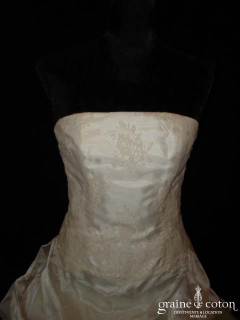 Robe une pièce en doupion ivoire : bustier empire drapé, effet soie sauvage du tissu. Jupe trapèze évasée avec petite traîne. Pure et élégante.
