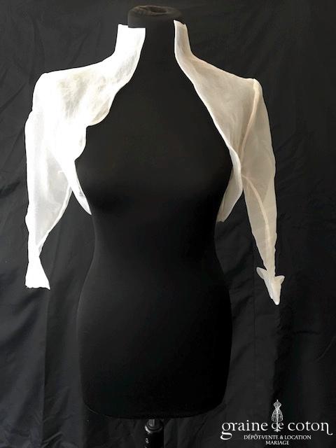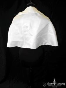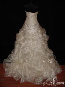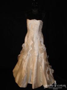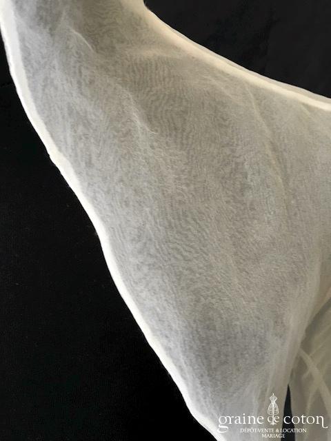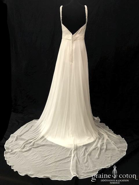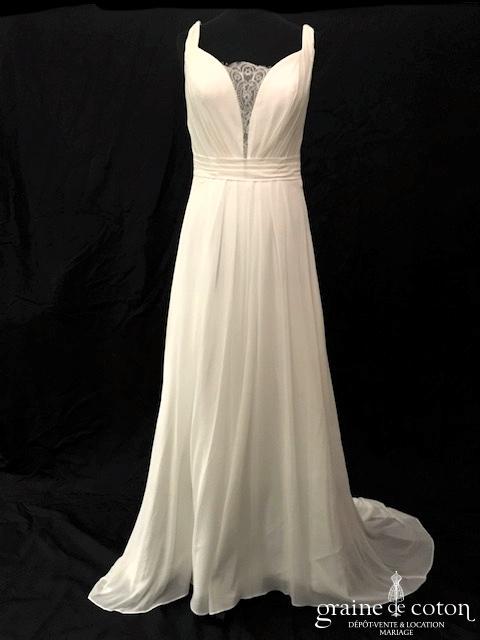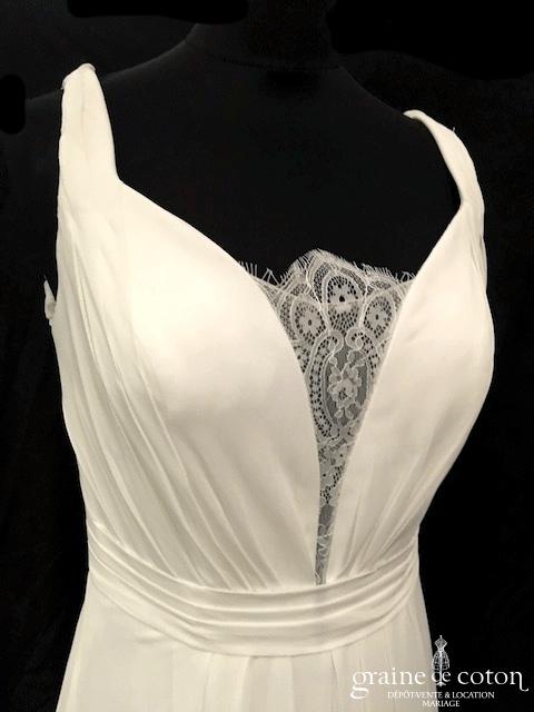 Robe une pièce ivoire clair : bustier en mousseline drapée avec bretelles, décolleté profond en V recouvert d’une fine dentelle de Chantilly. Dos nu puis boutonné. Jupe fluide tout en …