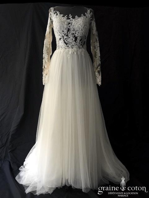Robe une pièce ivoire clair : top en tulle couleur chair recouvert de guipure ivoire pour un effet tatouage, dos entièrement boutonné, manches longues. Jupe sirène en crêpe fluide avec …