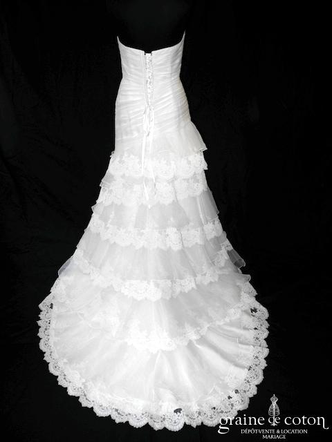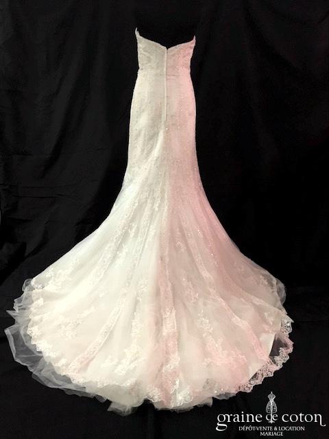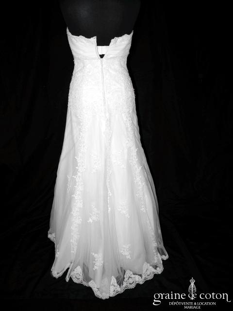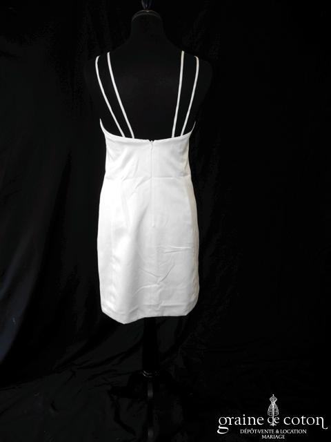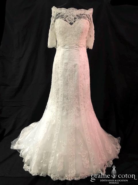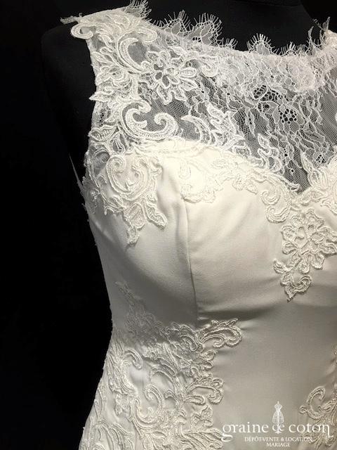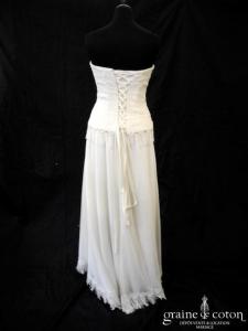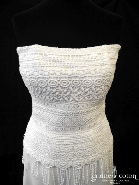Robe une pièce tout en dentelle ivoire clair : top à encolure américaine et décolleté en V, dos nu. Jupe taille haute coupe patineuse, courte (au genou) devant et longue …