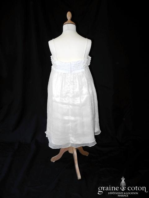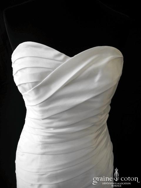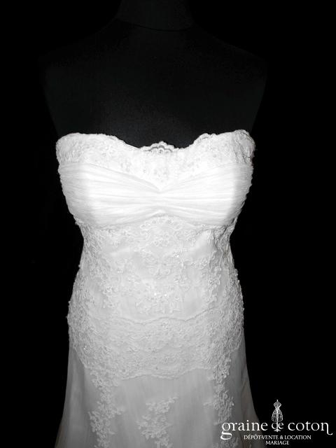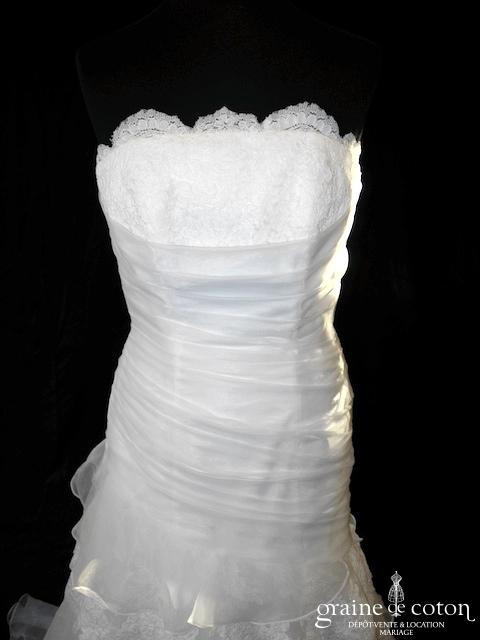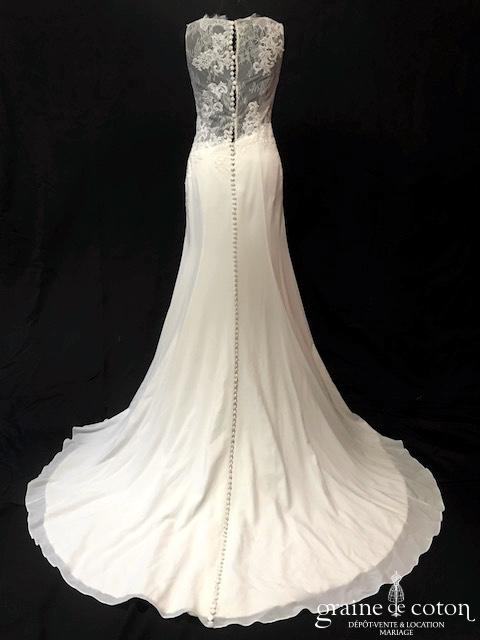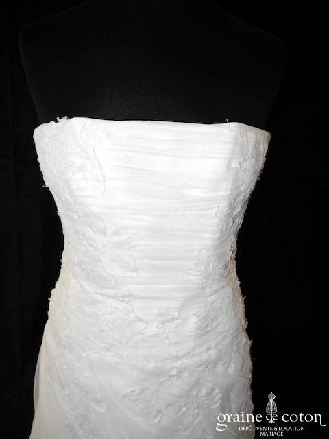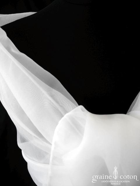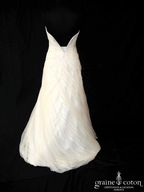 Robe une pièce en tulle fluide ivoire clair : top décolleté V drapé avec bretelles, dos nu. Jupe taille haute épurée évasée avec petite traîne. Seyante et élégante.