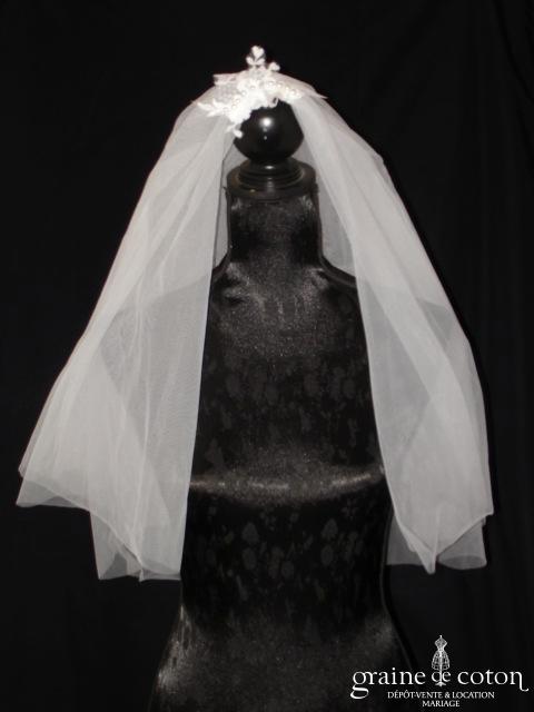Voile mi long avec 3 rabats de tulle blanc bordé de biais de satin. Monté sur peigne.