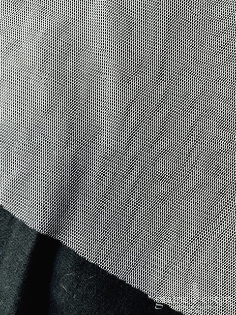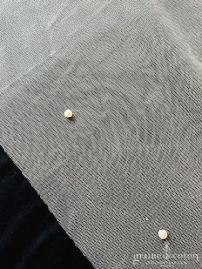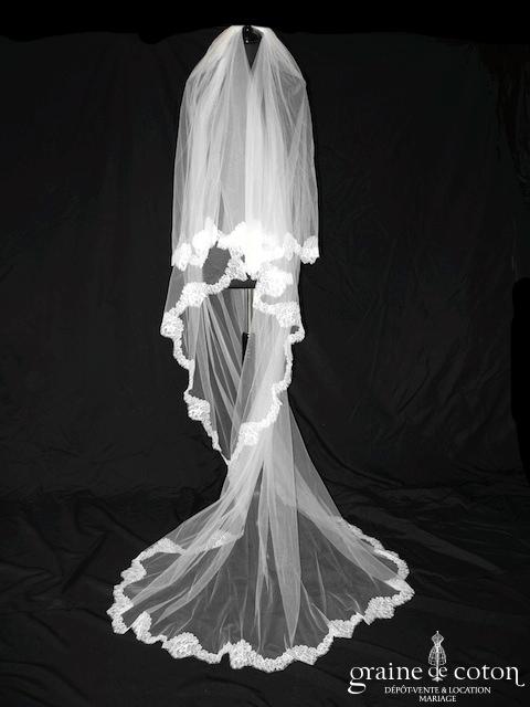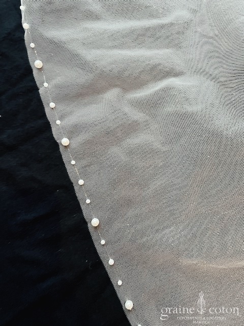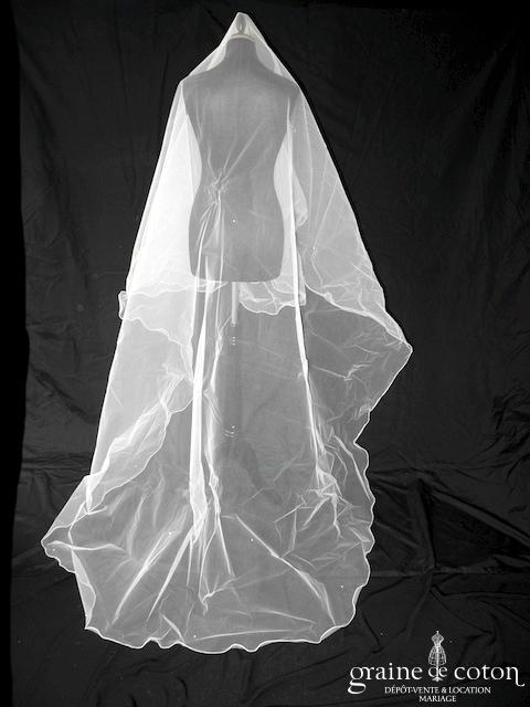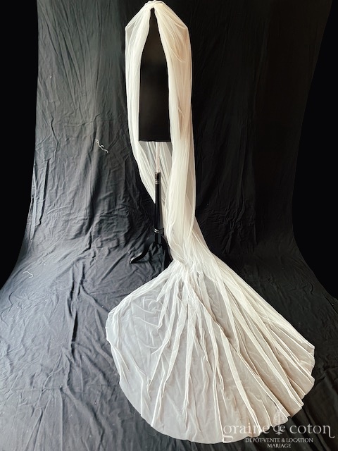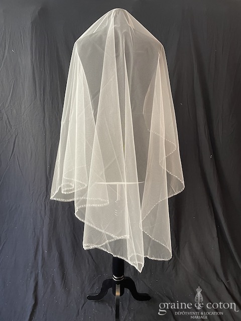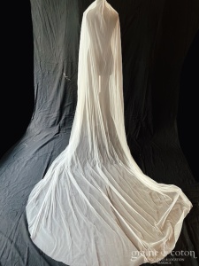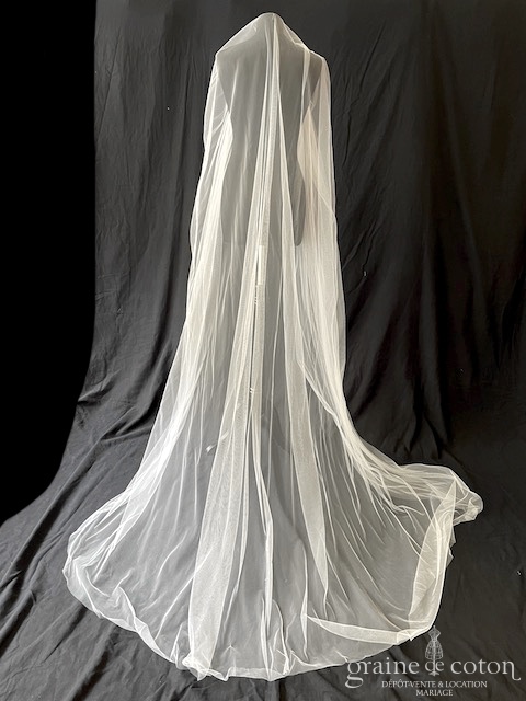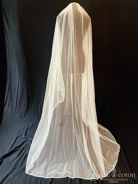 Voile long de 2,50 mètres en tulle blanc avec perles, non monté sur peigne. Bords roulottés surjetés.
