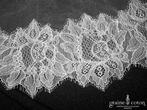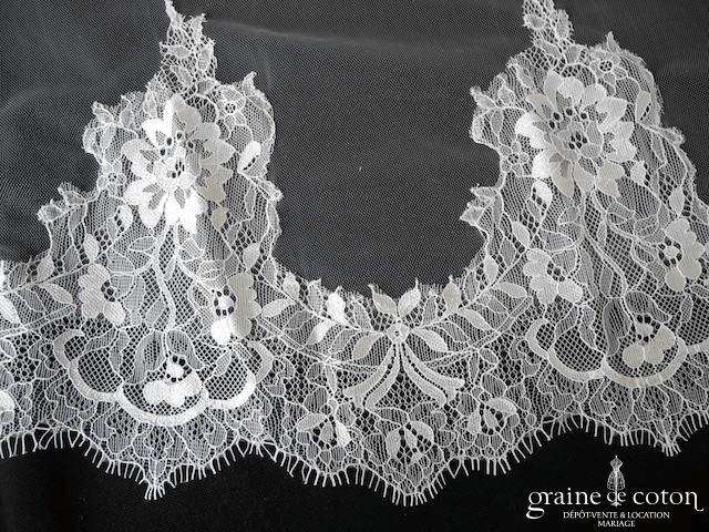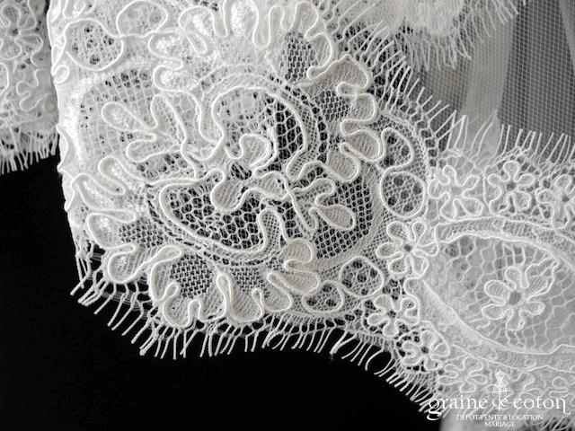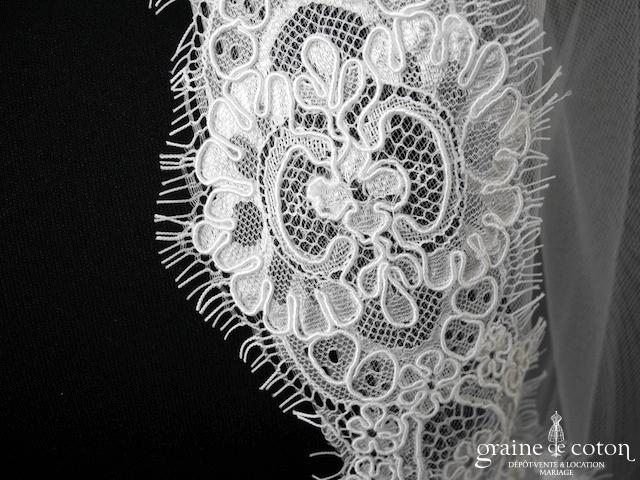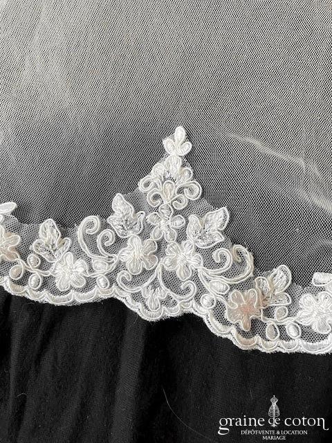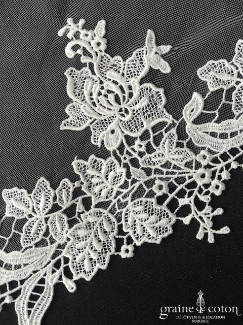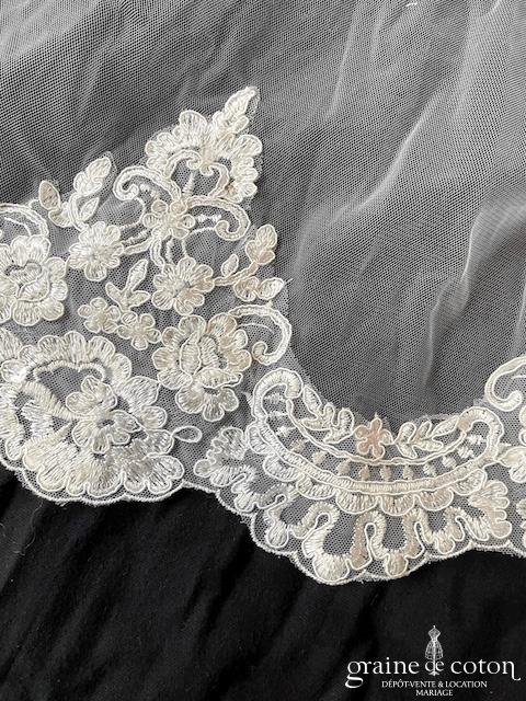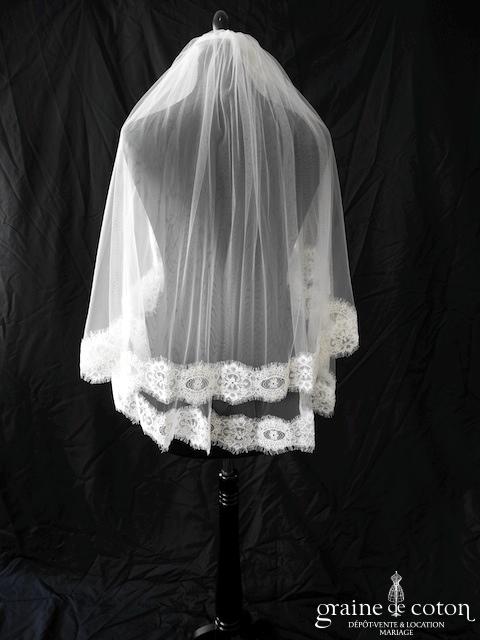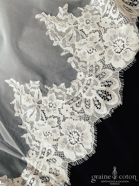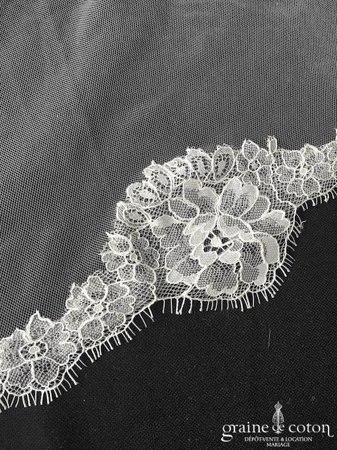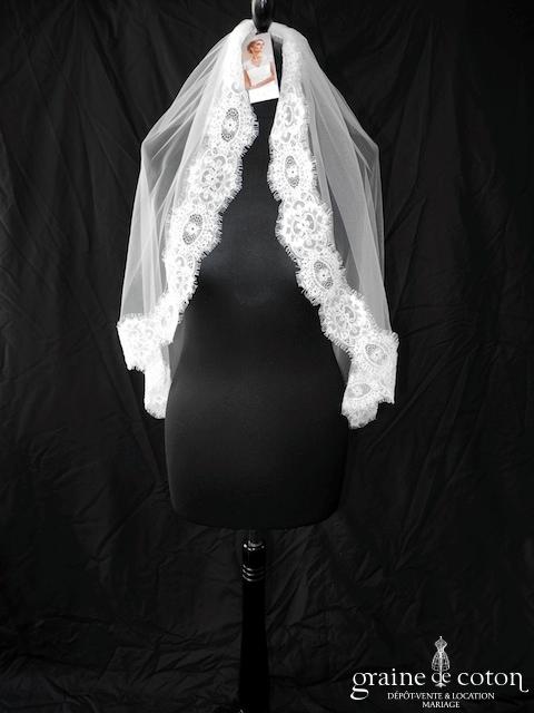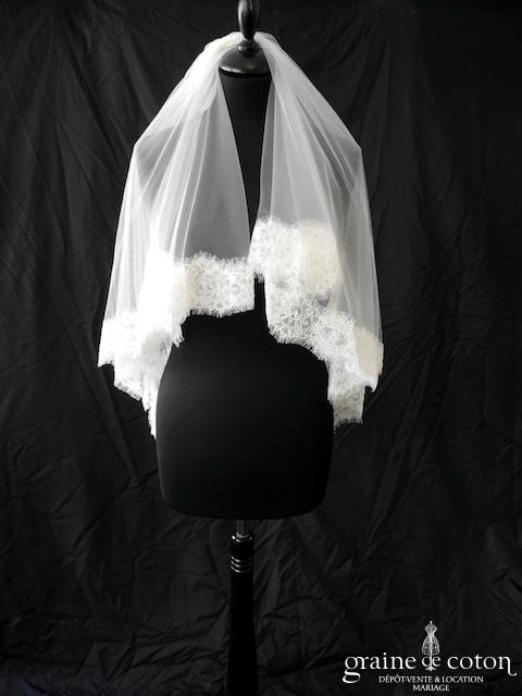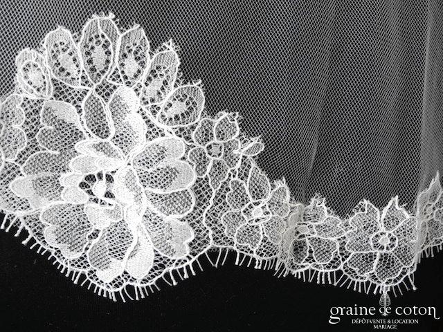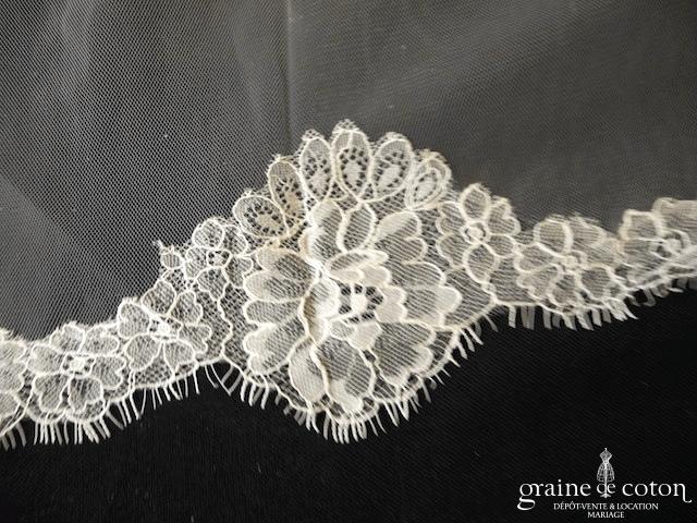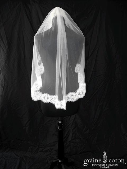 Voile court en tulle souple blanc et fine dentelle de calais. Non monté, à fixer à des pics à chignon.