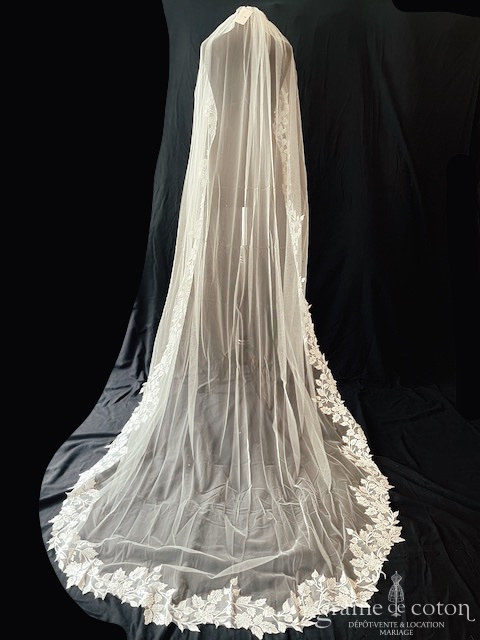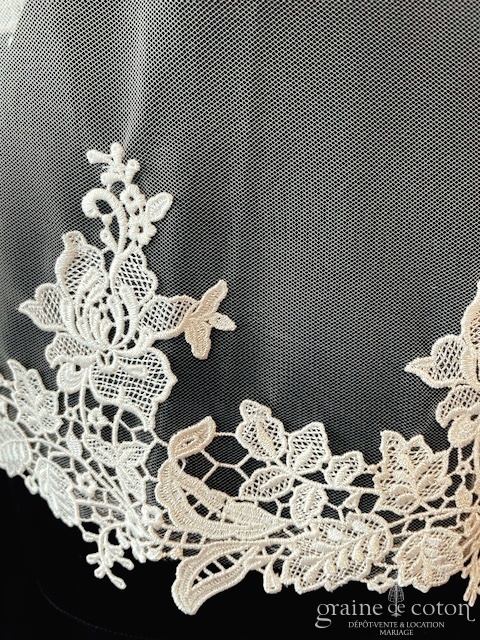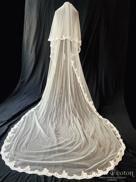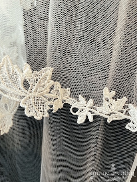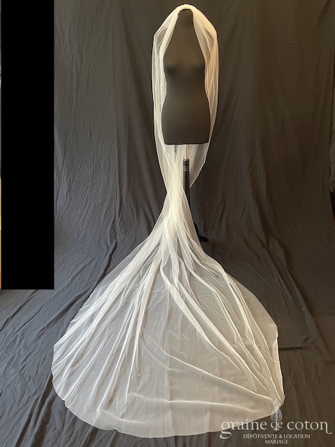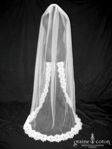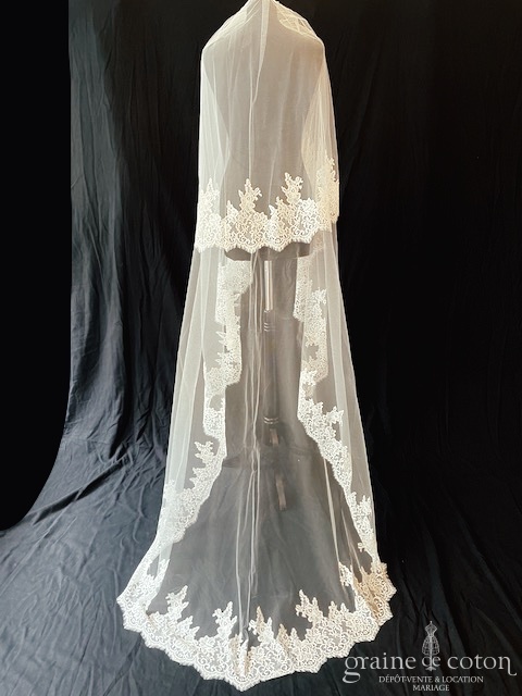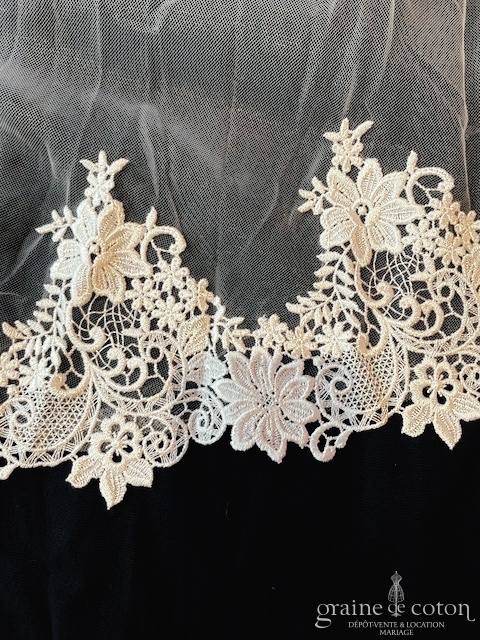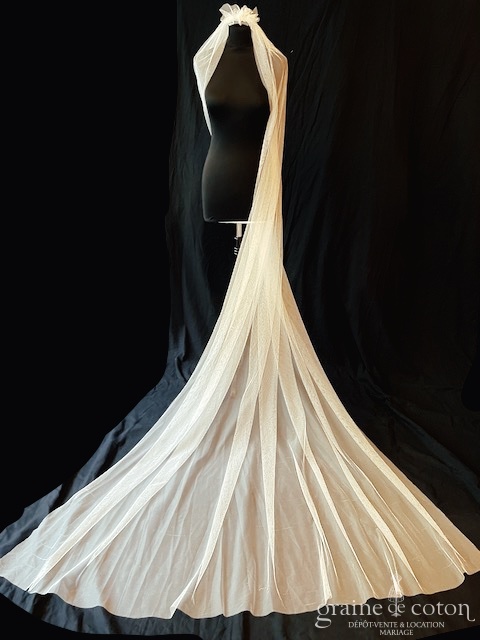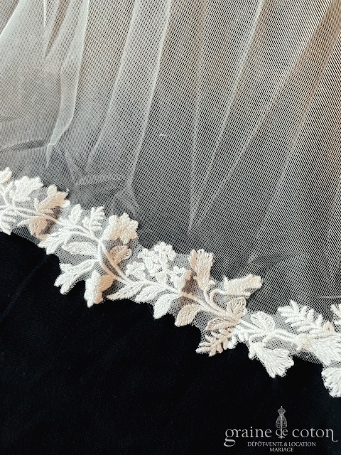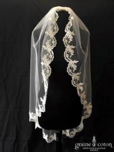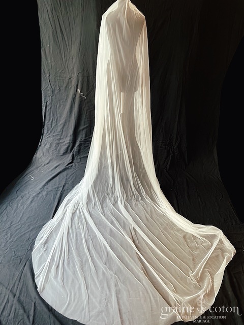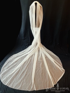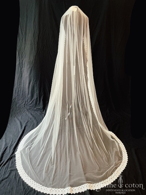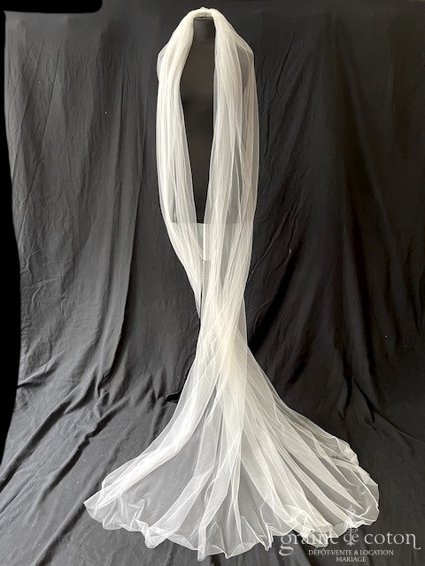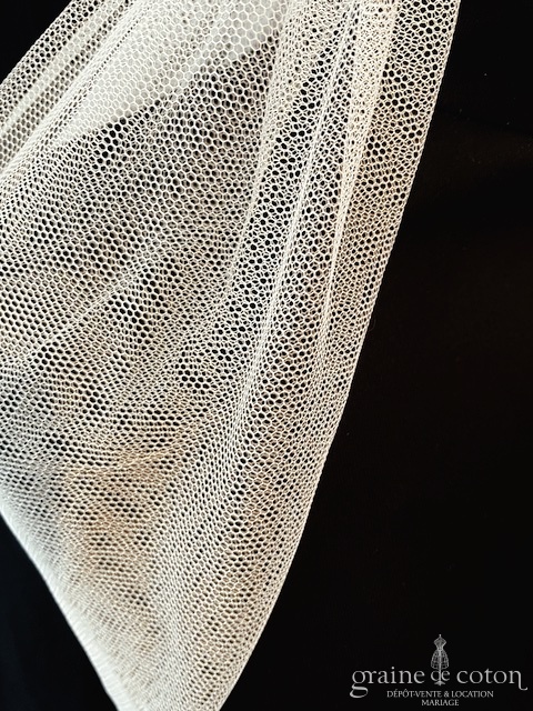 Voile long de 2 mètres en tulle ivoire bordé d’un biais de satin. Monté sur peigne, avec rabat avant.