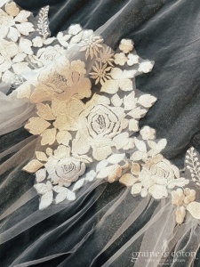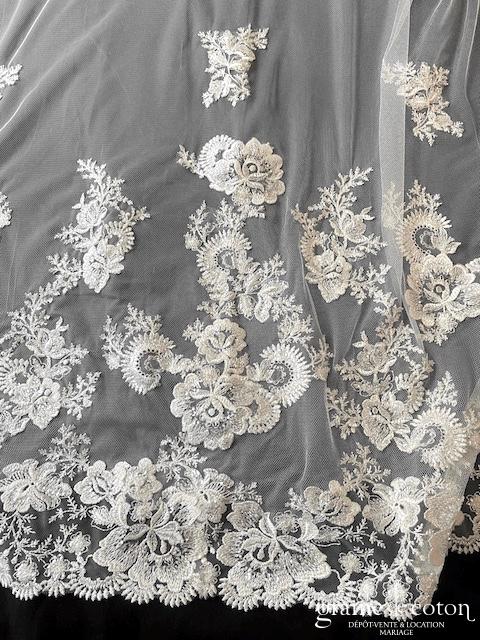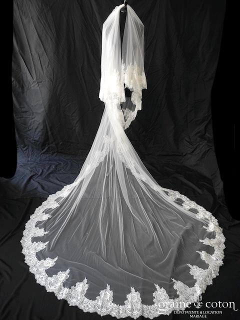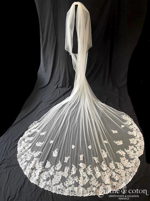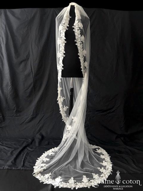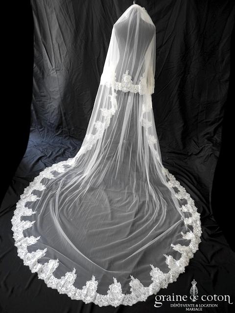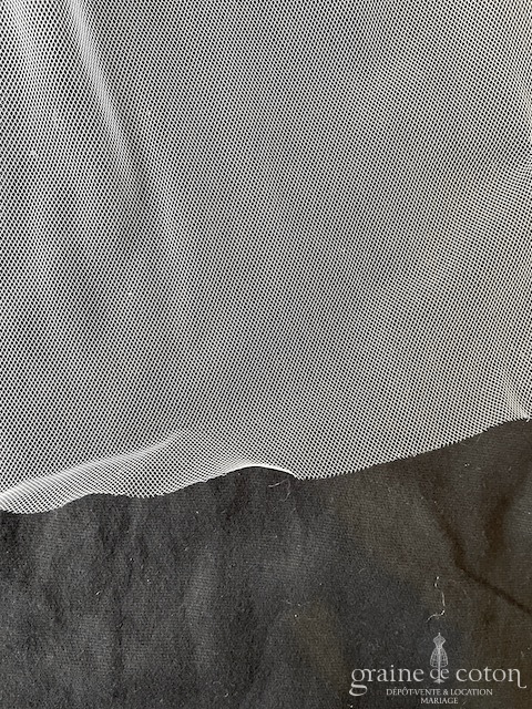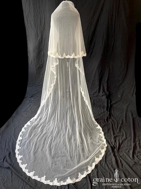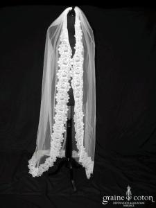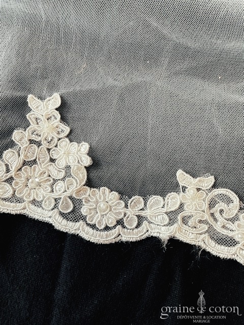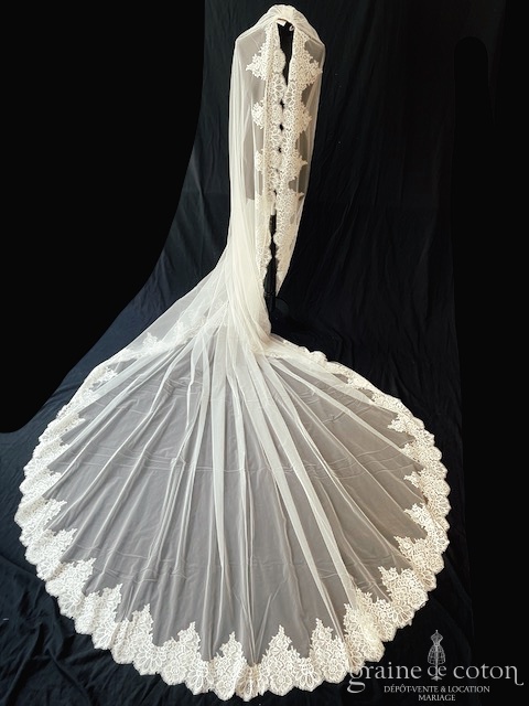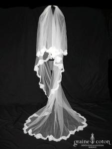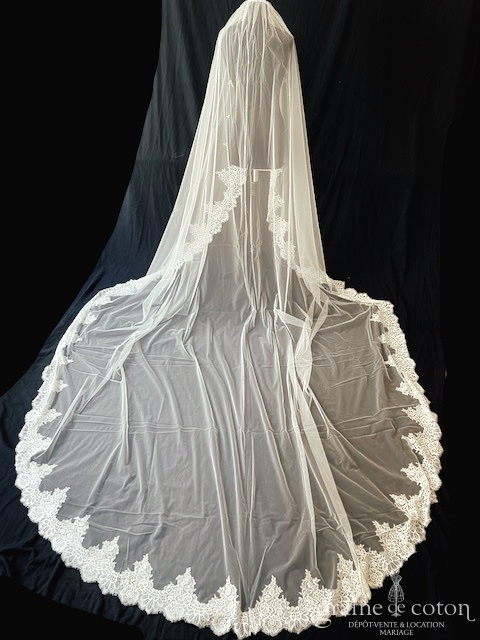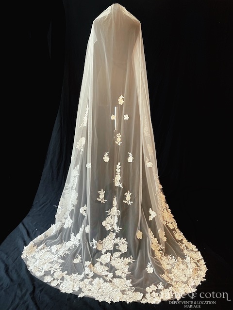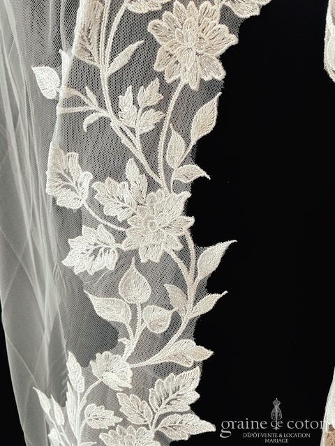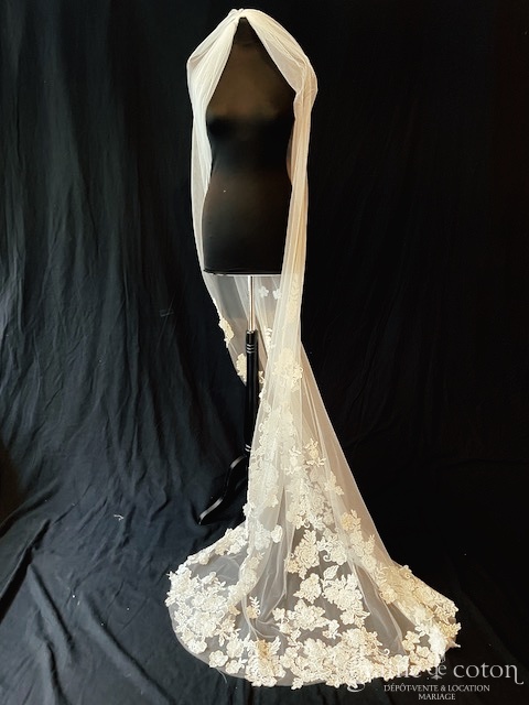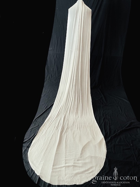 Voile long de 2 mètres en tulle ivoire bordé d’un biais de satin. Monté sur peigne, avec rabat avant.